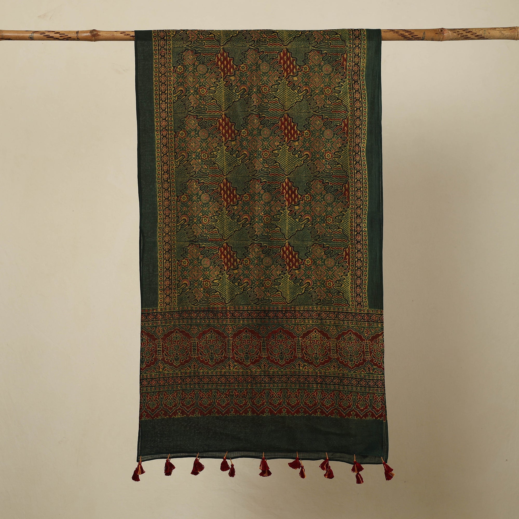Enhance your wardrobe with this exquisite green block print mul cotton ajrakh stole, adorned with delicate tassels. Created using the traditional ajrakh hand block printing technique by master artisan Sufiyan Khatri from the Kutch region of Gujarat, this stole showcases intricate motifs crafted with natural dyes. Its versatile design effortlessly complements both ethnic and modern ensembles, making it a timeless and elegant accessory for any occasion.