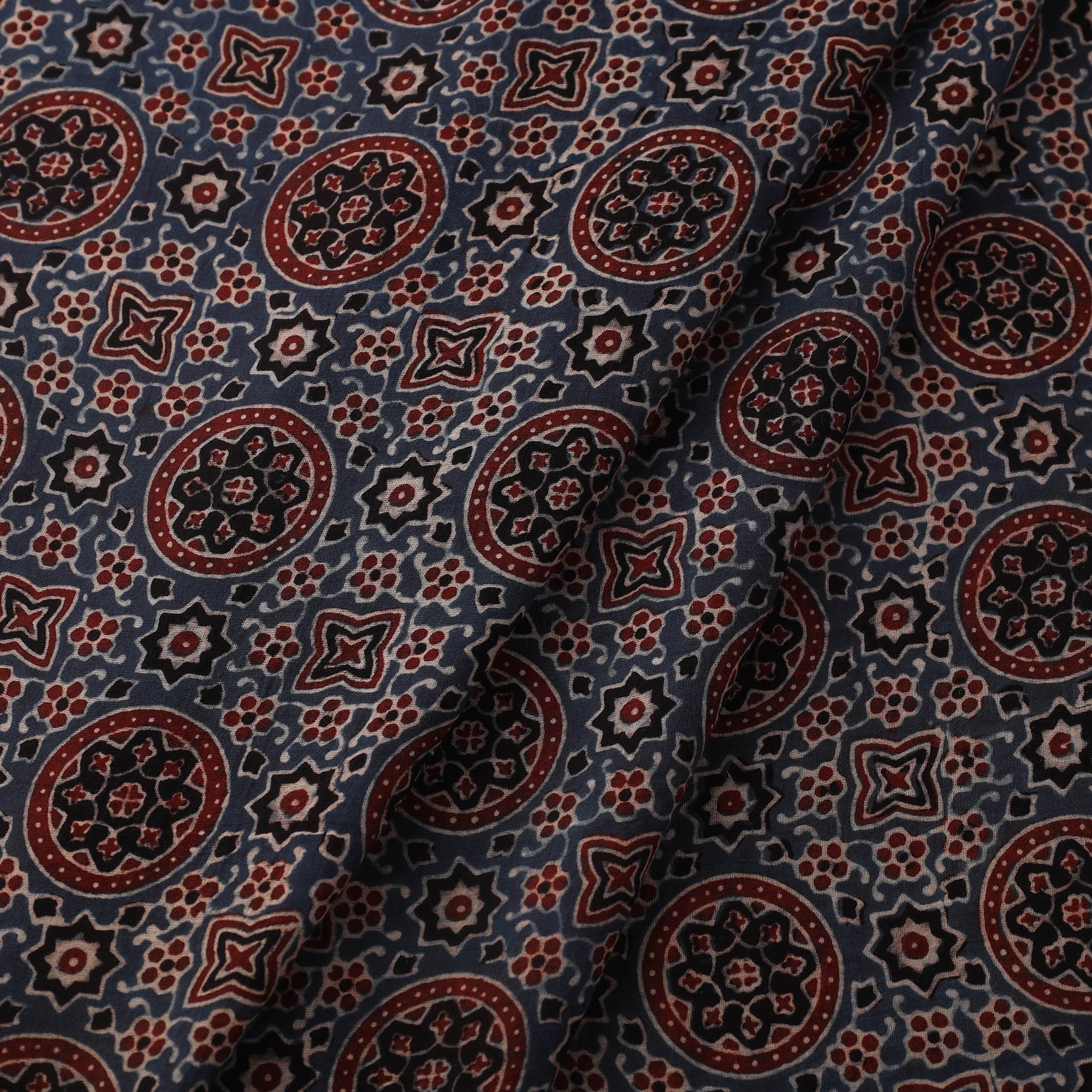 Handcrafted in Kutch by artisan Sufiyan Ismail Khatri, this blue mul cotton ajrakh fabric features intricate block prints made using carved wooden blocks and natural dyes. The patterns reflect centuries-old traditions from the region. Soft, breathable, and versatile, it's perfect for kurtas, dresses, or blouses. An authentic Indian textile that celebrates the legacy of ajrakh printing.