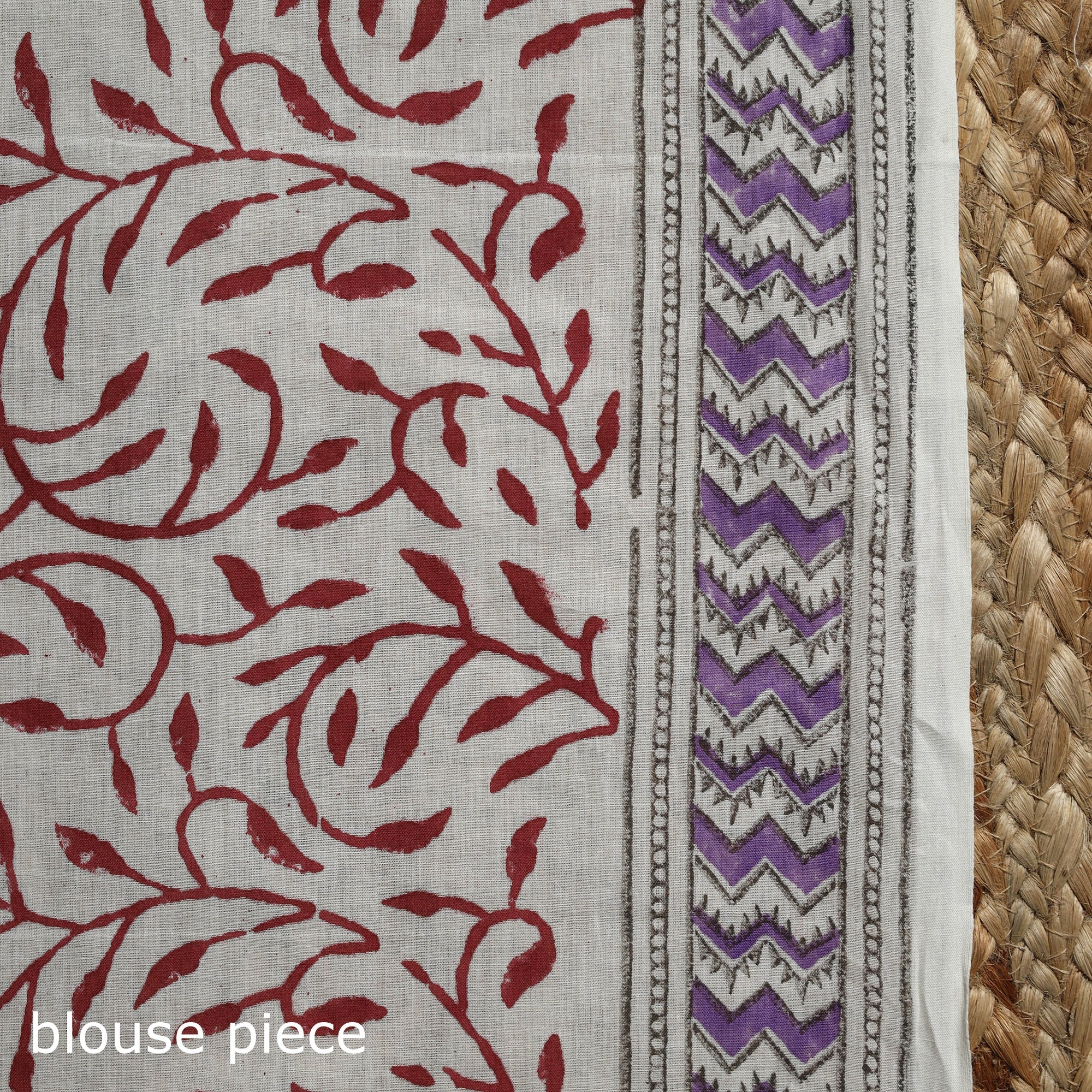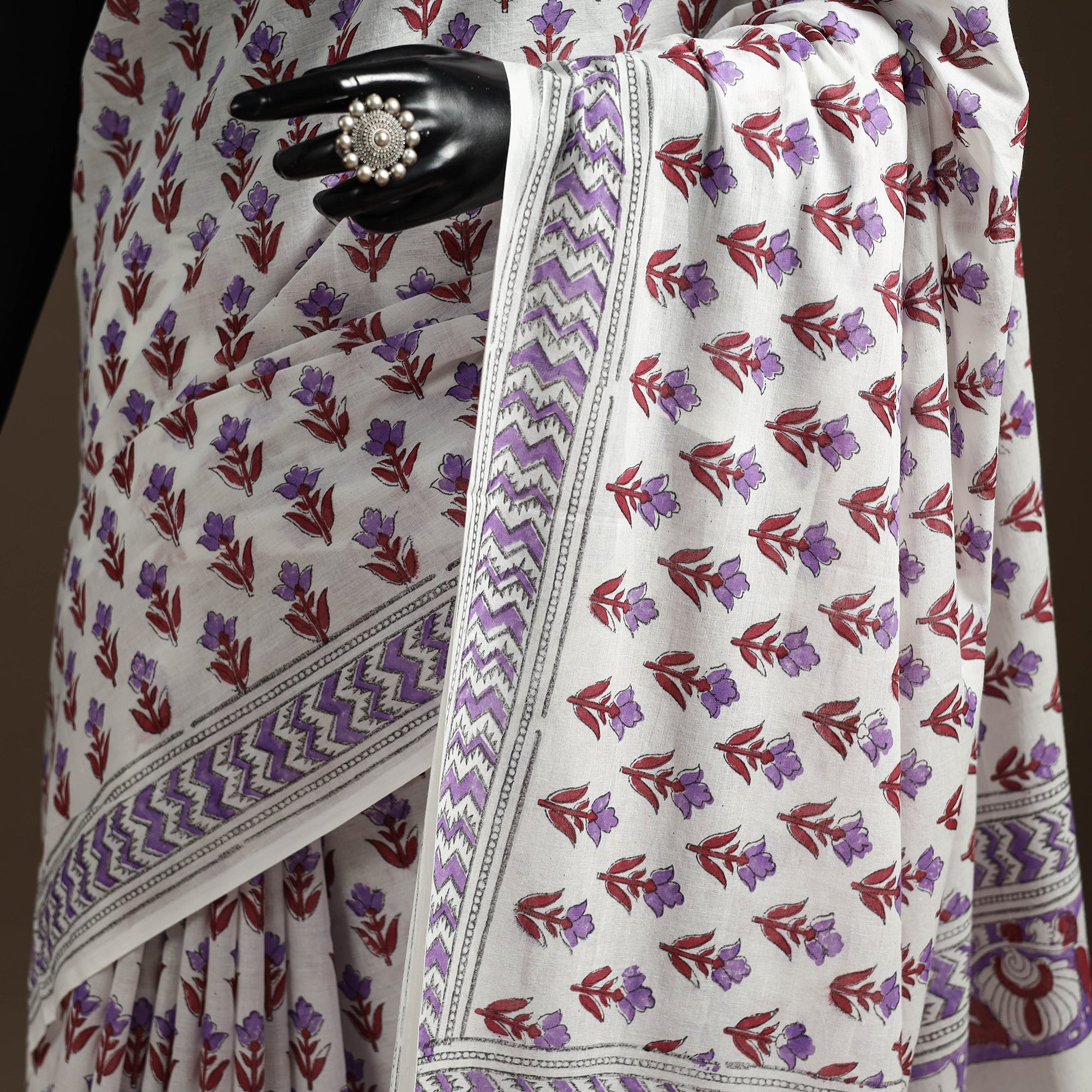 Block print mul cotton purple sanganeri saree, crafted using traditional techniques from Sanganer, Jaipur Rajasthan. Adorned with intricate floral and geometric patterns, this saree is printed using bleed-free VAT dyes, ensuring long-lasting vibrancy. Made from lightweight and breathable mul cotton, making it an ideal choice for both daily wear and special occasions with an elegant touch.