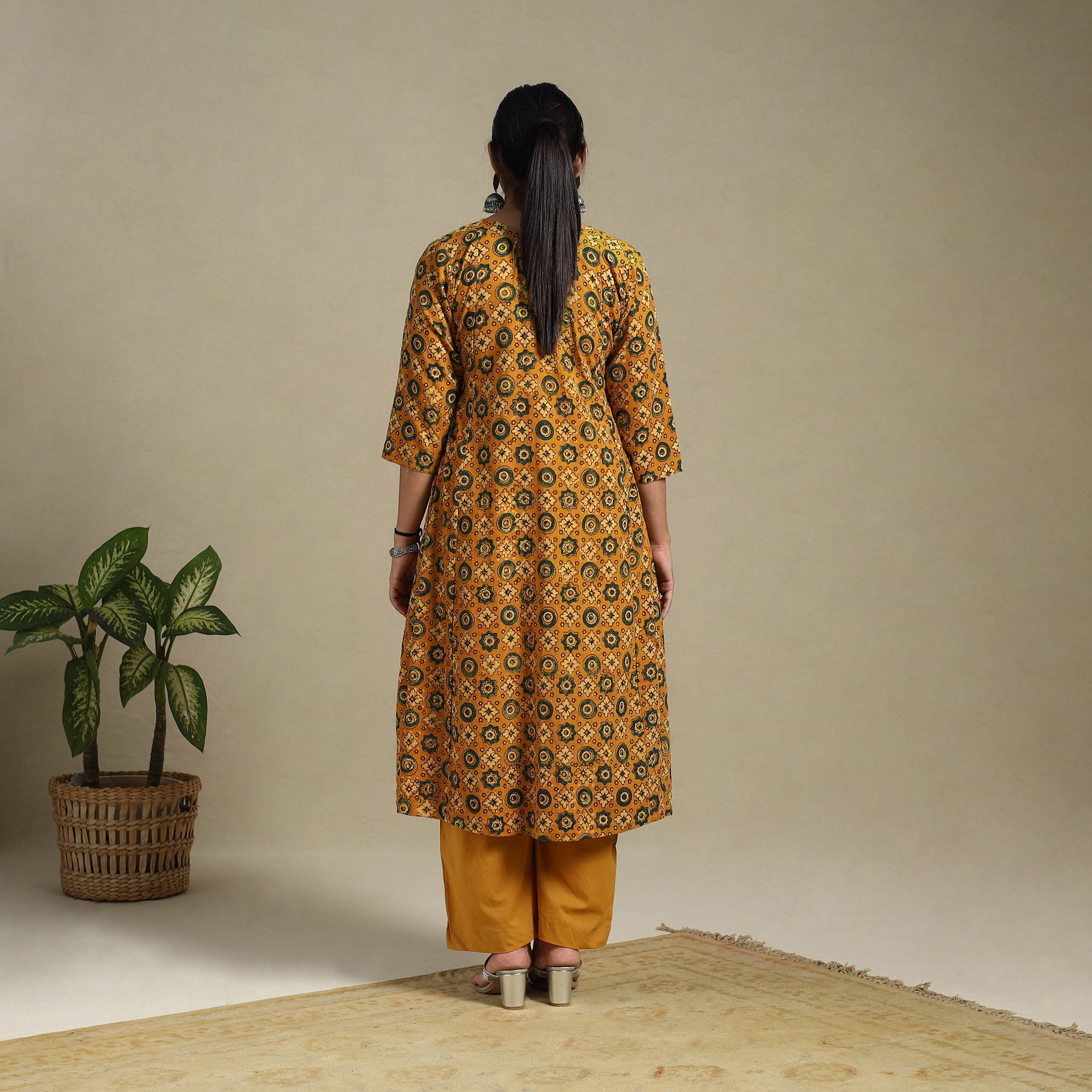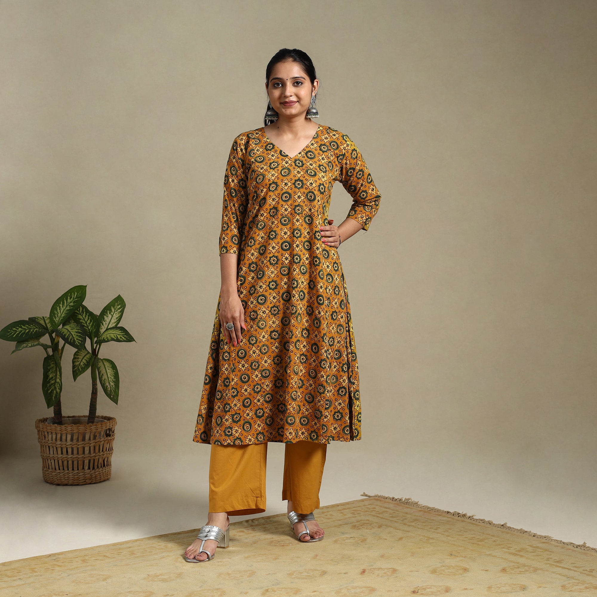 Step into effortless elegance with this orange block-printed cotton A-line Ajrakh kurta. Crafted using naturally dyed fabric through the traditional Ajrakh hand block printing method, this kurta merges rich heritage with everyday style. The breathable cotton fabric ensures day-long comfort, and the addition of a functional side pocket adds a practical touch making it ideal for relaxed outings or festive occasions.