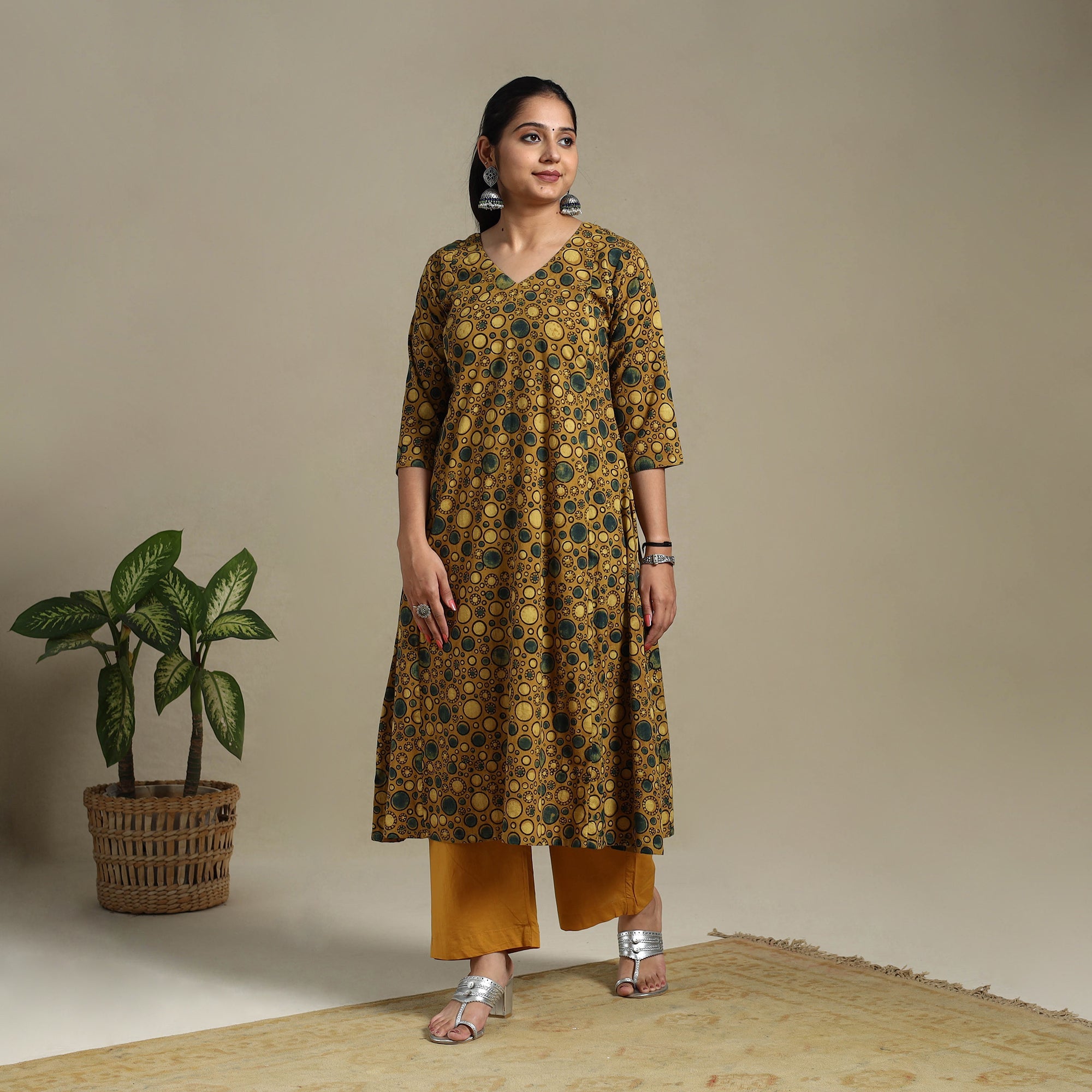 Step into effortless elegance with this yellow block-printed cotton A-line Ajrakh kurta. Crafted using naturally dyed fabric through the traditional Ajrakh hand block printing method, this kurta merges rich heritage with everyday style. The breathable cotton fabric ensures day-long comfort, and the addition of a functional side pocket adds a practical touch making it ideal for relaxed outings or festive occasions.