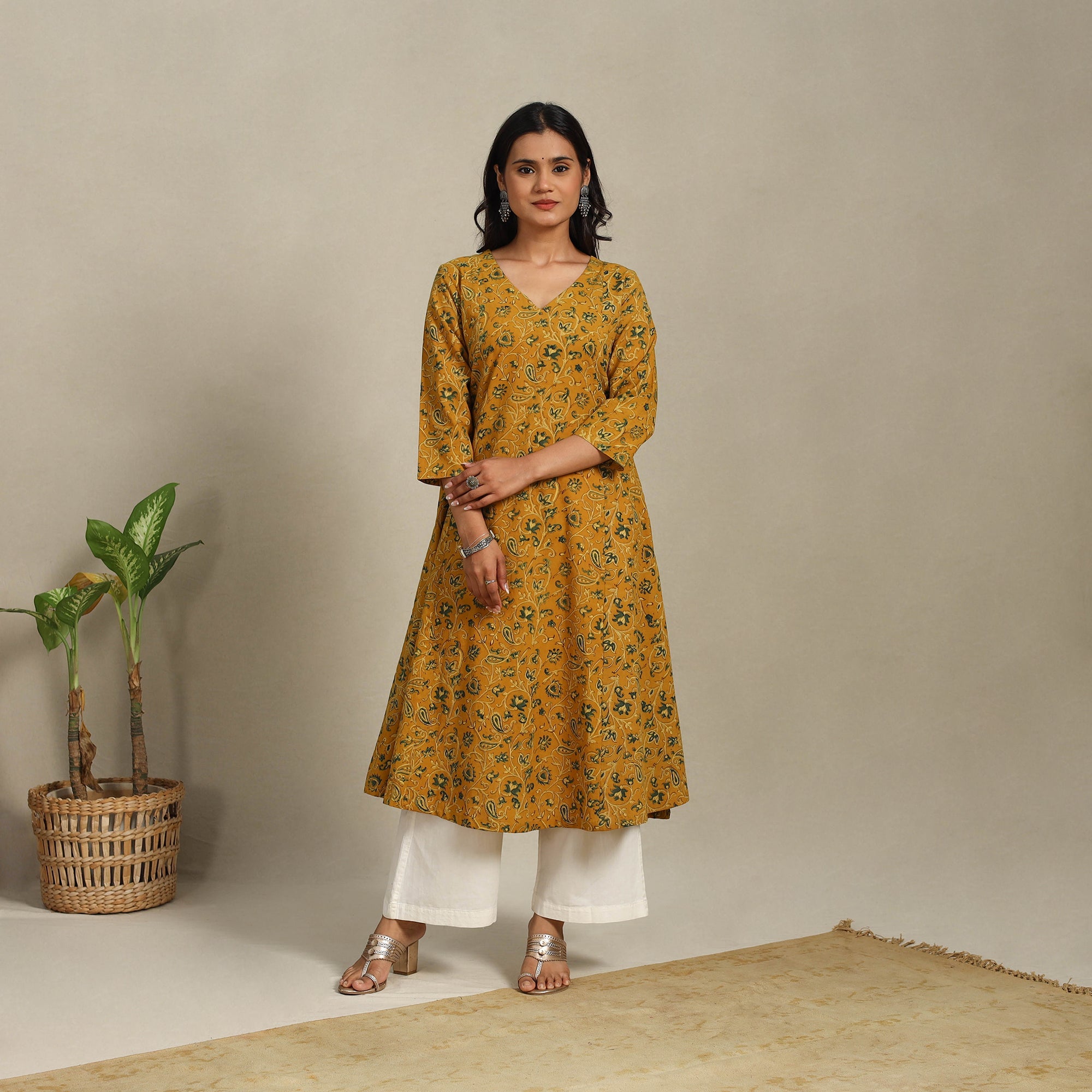 Look and feel beautiful in this A-line yellow ajrakh kurta. Crafted from naturally dyed fabric using the traditional ajrakh block printing method, it blends timeless design with everyday comfort. The breathable cotton fabric offers all-day ease, while a functional side pocket adds practicality, perfect for casual outings or festive gatherings.