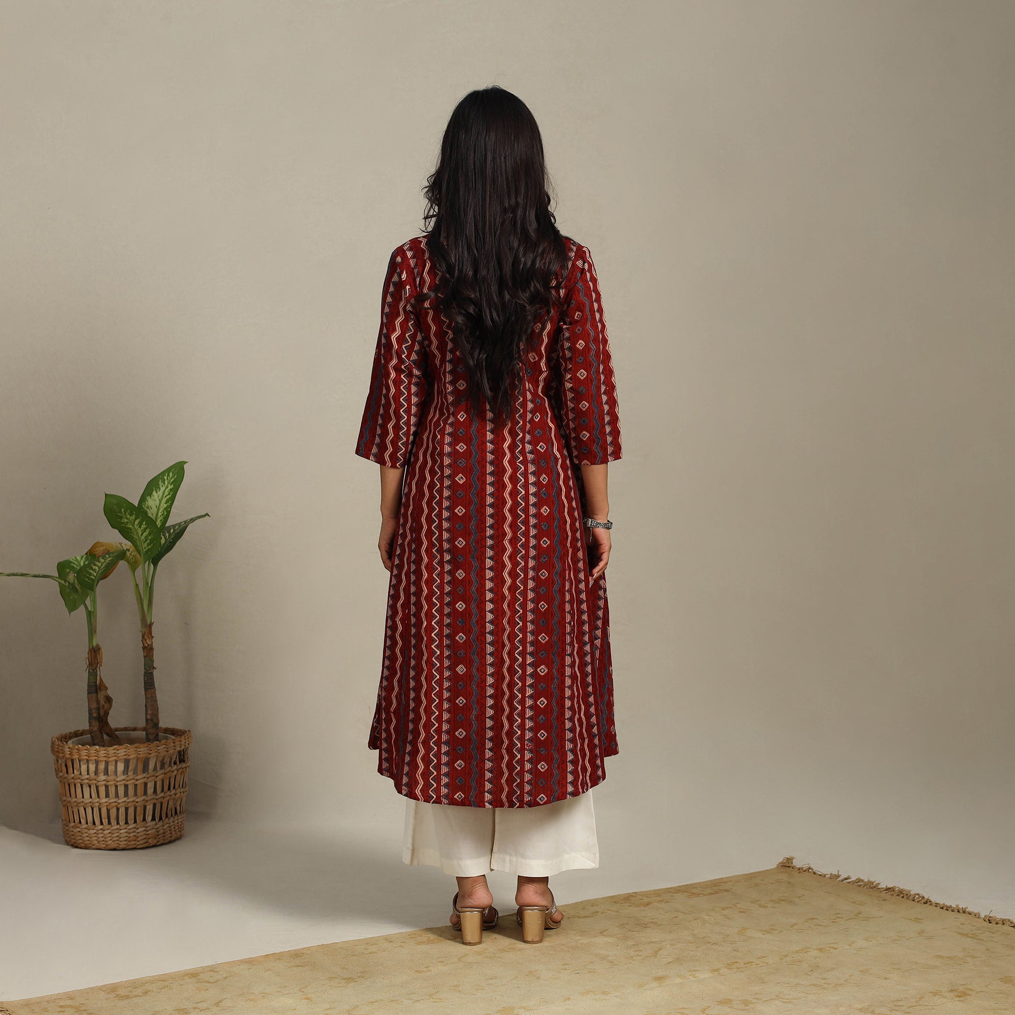 Look and feel beautiful in this A-line red ajrakh kurta. Crafted from naturally dyed fabric using the traditional ajrakh block printing method, it blends timeless design with everyday comfort. The breathable cotton fabric offers all-day ease, while a functional side pocket adds practicality, perfect for casual outings or festive gatherings.