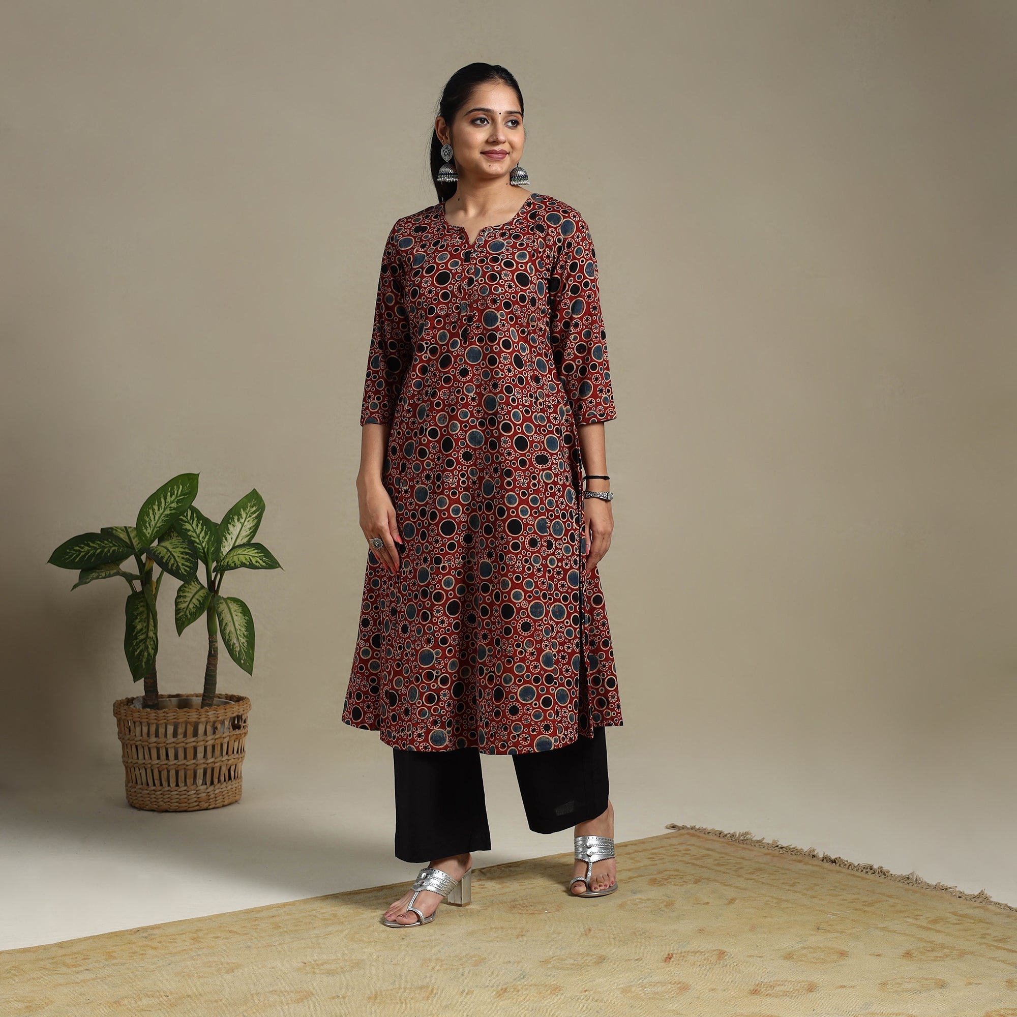 Step into effortless elegance with this red block-printed cotton A-line Ajrakh kurta. Crafted using naturally dyed fabric through the traditional Ajrakh hand block printing method, this kurta merges rich heritage with everyday style. The breathable cotton fabric ensures day-long comfort, and the addition of a functional side pocket adds a practical touch making it ideal for relaxed outings or festive occasions.