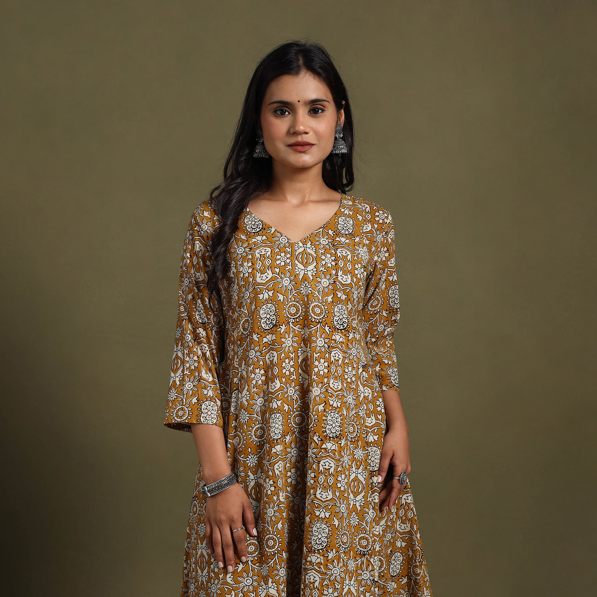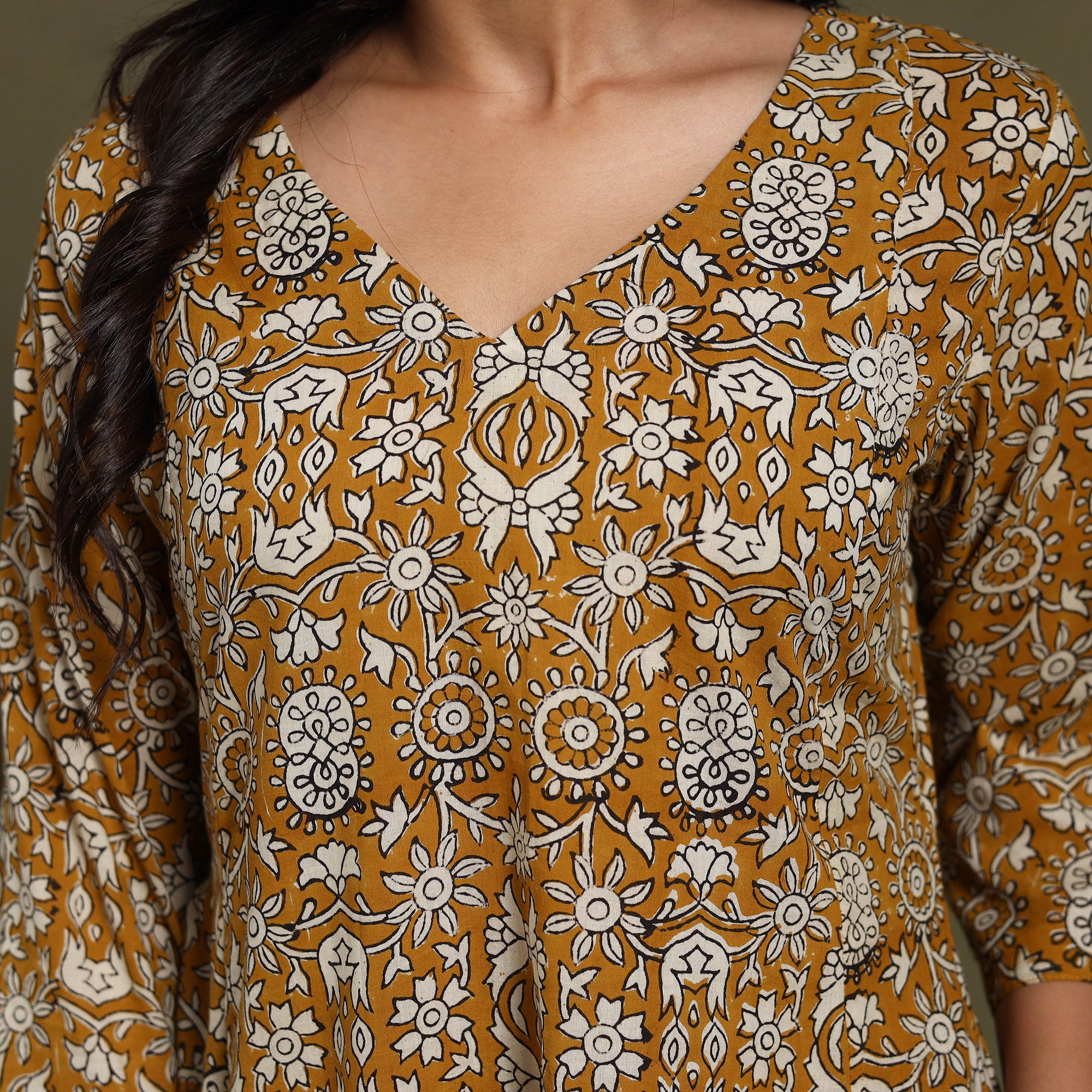 This yellow bagru hand block printed kurta is crafted from naturally dyed cotton fabric using the traditional mud-resist technique in Bagru, Rajasthan. Intricate patterns are created by skilled artisans using finely carved wooden blocks. Featuring a convenient side pocket, this A-line kurta blends style with practicality. Perfect for any occasion, its breathable cotton fabric ensures all-day comfort.