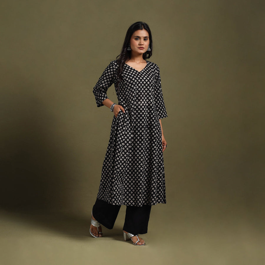 This black bagru hand block printed kurta is crafted from naturally dyed cotton fabric using the traditional mud-resist technique in Bagru, Rajasthan. Intricate patterns are created by skilled artisans using finely carved wooden blocks. Featuring a convenient side pocket, this A-line kurta blends style with practicality. Perfect for any occasion, its breathable cotton fabric ensures all-day comfort.
