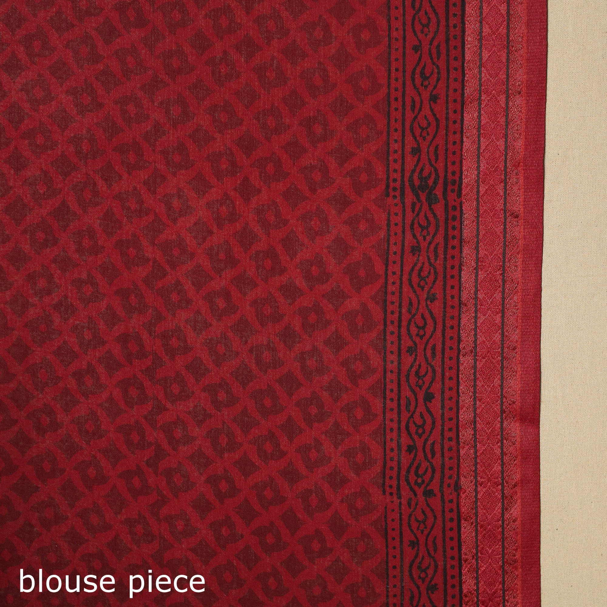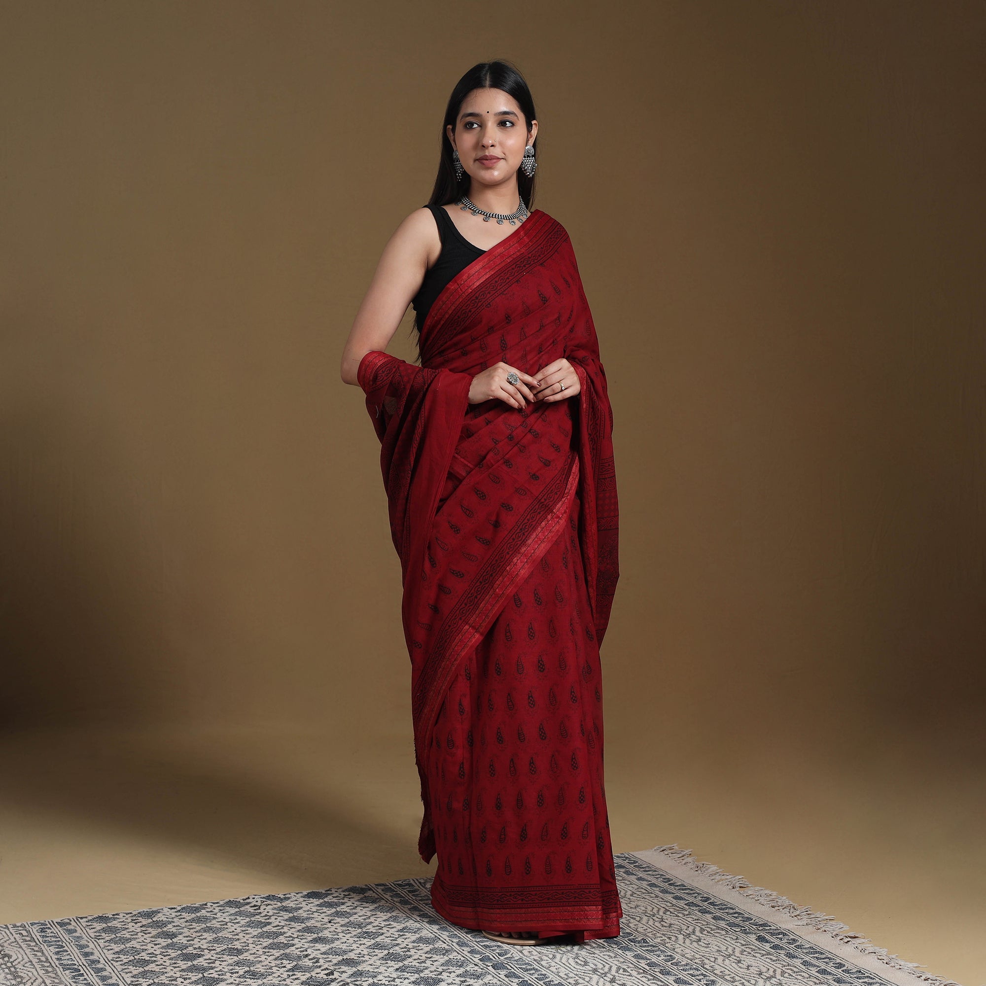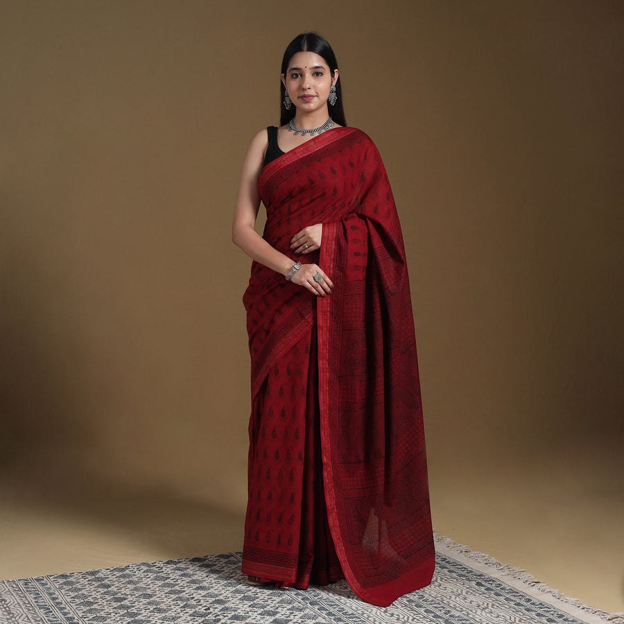 Experience the beauty of this red hand block-printed bagh cotton saree with a zari border. Made by master artisan Mohammed Bilal Khatri, the saree features fine patterns and deep colours created using natural dyes. Each piece reflects the traditional bagh printing style, a craft that originates from Madhya Pradesh. Its elegant appeal and handcrafted charm make it ideal for festive days, special events, or thoughtful gifting.