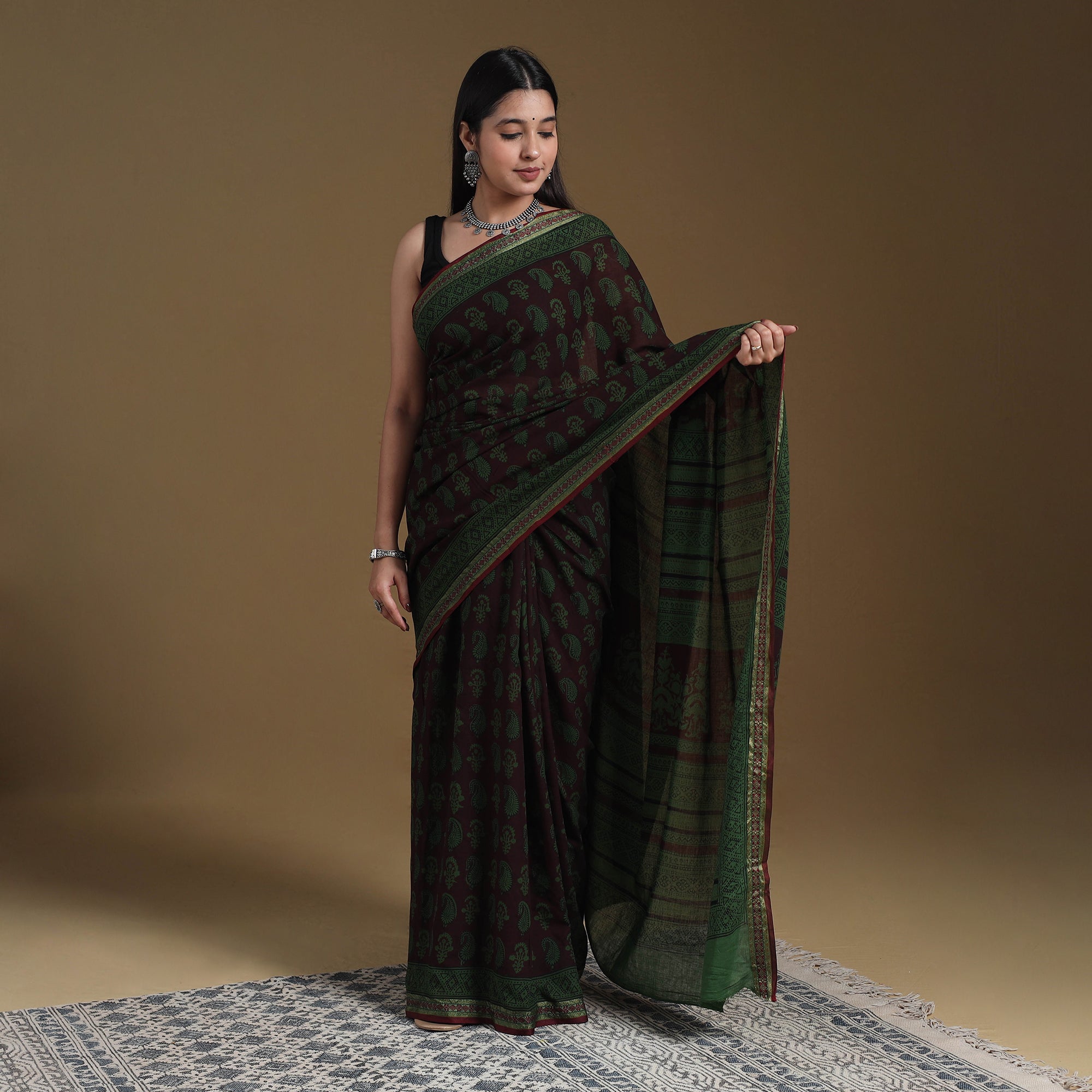 | Material | Experience the beauty of this green hand block-printed bagh cotton saree with a zari border. Made by master artisan Mohammed Bilal Khatri, the saree features fine patterns and deep colours created using natural dyes. Each piece reflects the traditional bagh printing style, a craft that originates from Madhya Pradesh. Its elegant appeal and handcrafted charm make it ideal for festive days, special events, or thoughtful gifting. |