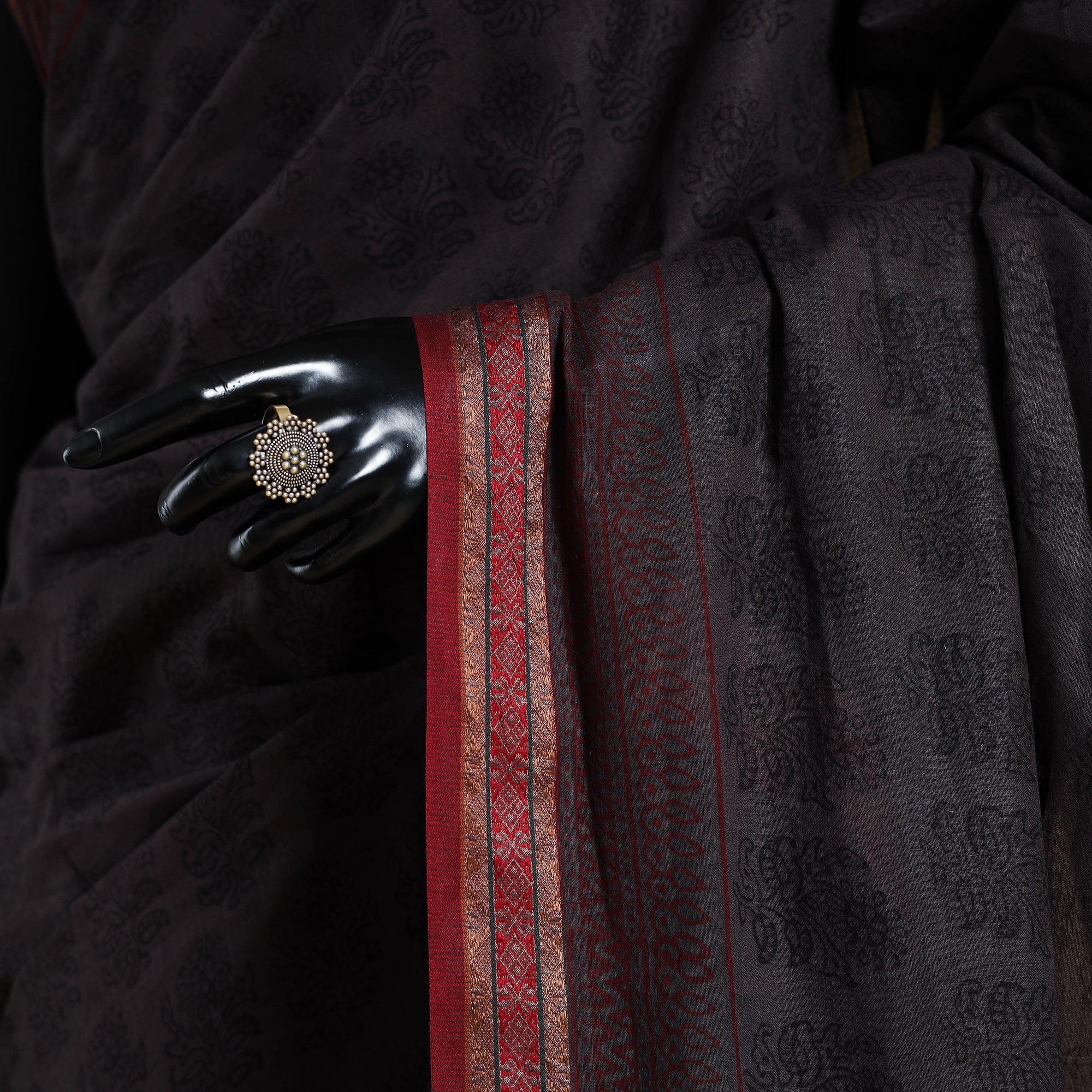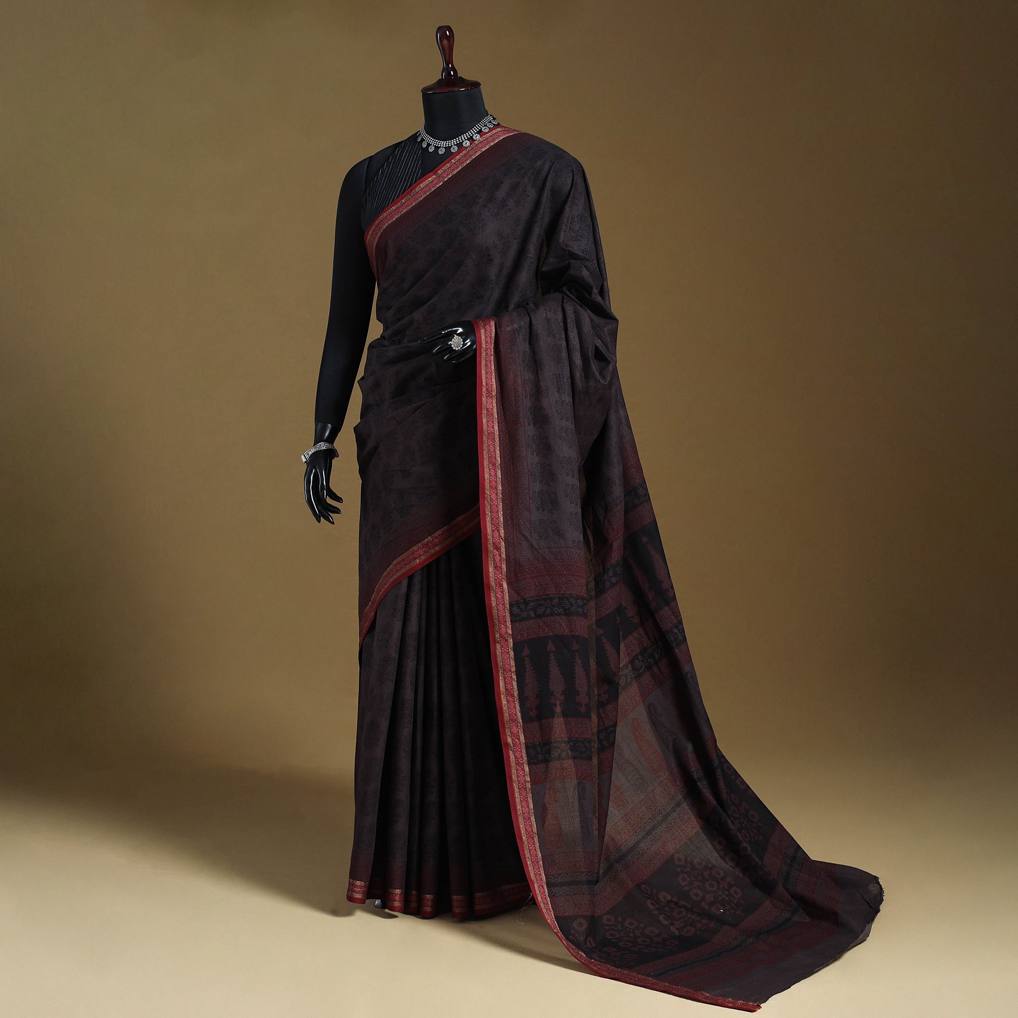 Experience the beauty of this grey hand block-printed bagh cotton saree with a zari border. Made by master artisan Mohammed Bilal Khatri, the saree features fine patterns and deep colours created using natural dyes. Each piece reflects the traditional bagh printing style, a craft that originates from Madhya Pradesh. Its elegant appeal and handcrafted charm make it ideal for festive days, special events, or thoughtful gifting.