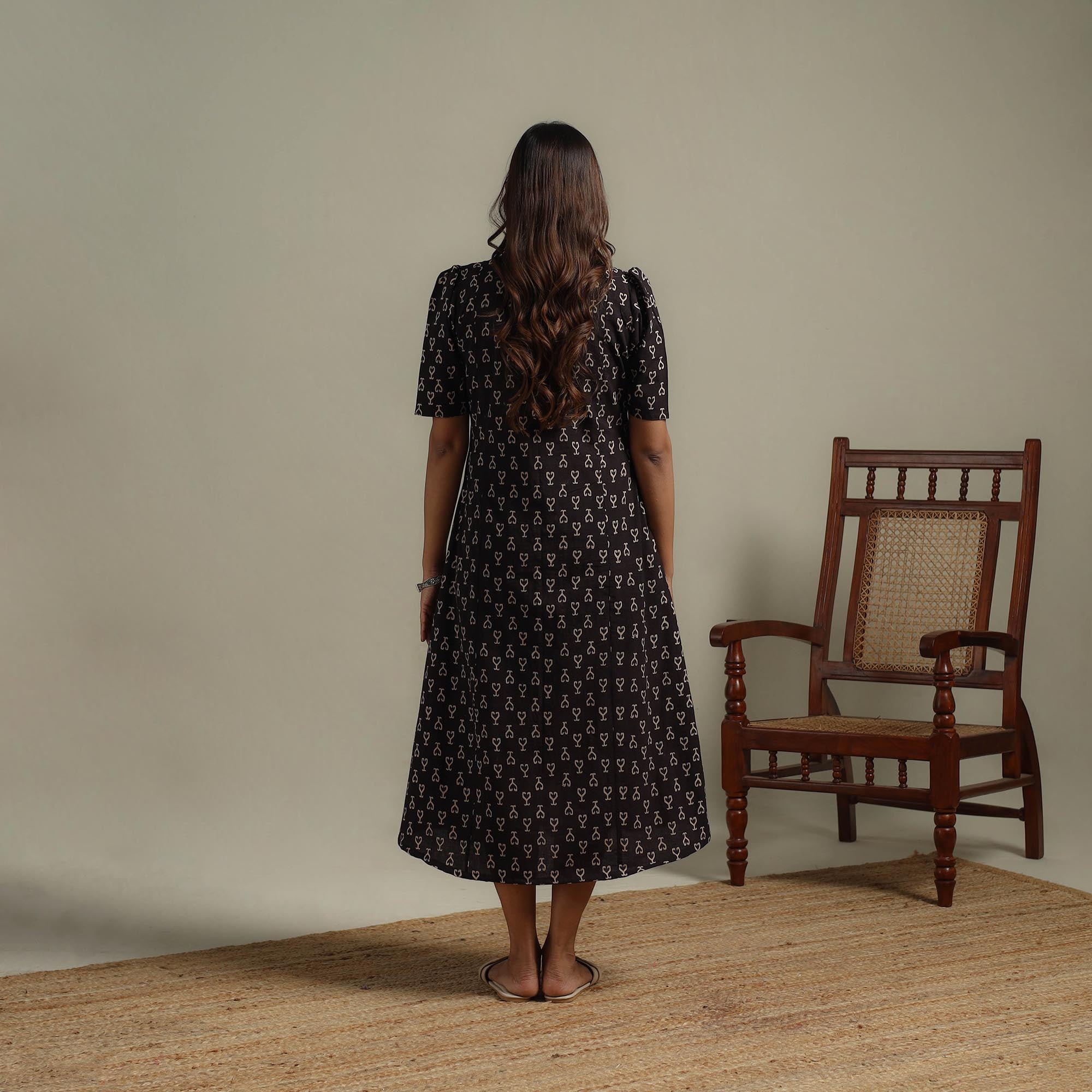 Black ajrakh pure cotton dress crafted using natural dyeing and resist block-printing techniques. This ancient craft is estimated to be around 4,500 years old. Its button-down design gives it a refined, elegant look. Comfortable and easy to wear, it comes with a side pocket for added convenience. It’s ideal for relaxed homewear, casual outings, thoughtful gifting, and even wearing on special days.
