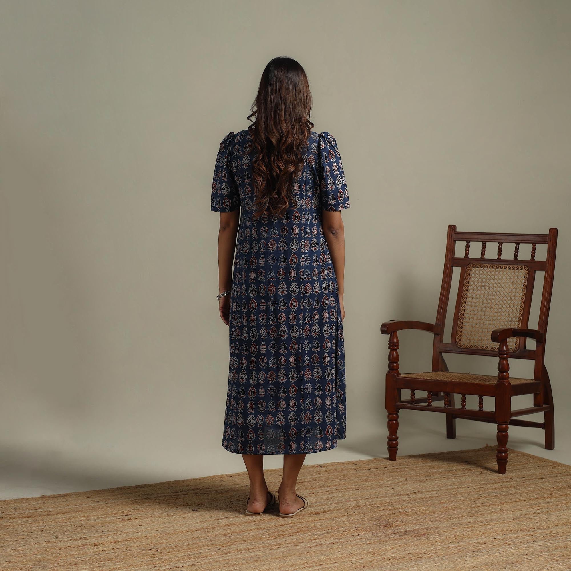 Blue ajrakh pure cotton dress crafted using natural dyeing and resist block-printing techniques. This ancient craft is estimated to be around 4,500 years old. Its button-down design gives it a refined, elegant look. Comfortable and easy to wear, it comes with a side pocket for added convenience. It’s ideal for relaxed homewear, casual outings, thoughtful gifting, and even wearing on special days.