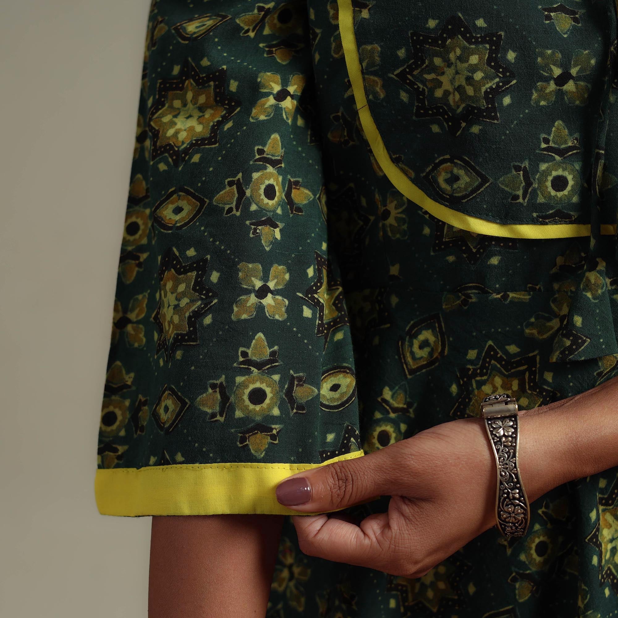 Green ajrakh pure cotton dress crafted using natural dyeing and resist block-printing techniques. This ancient craft is estimated to be around 4,500 years old. Its front dori neck and flared design gives it a refined, elegant look. Comfortable and easy to wear, it’s ideal for relaxed homewear, casual outings, thoughtful gifting and even wearing on special days.