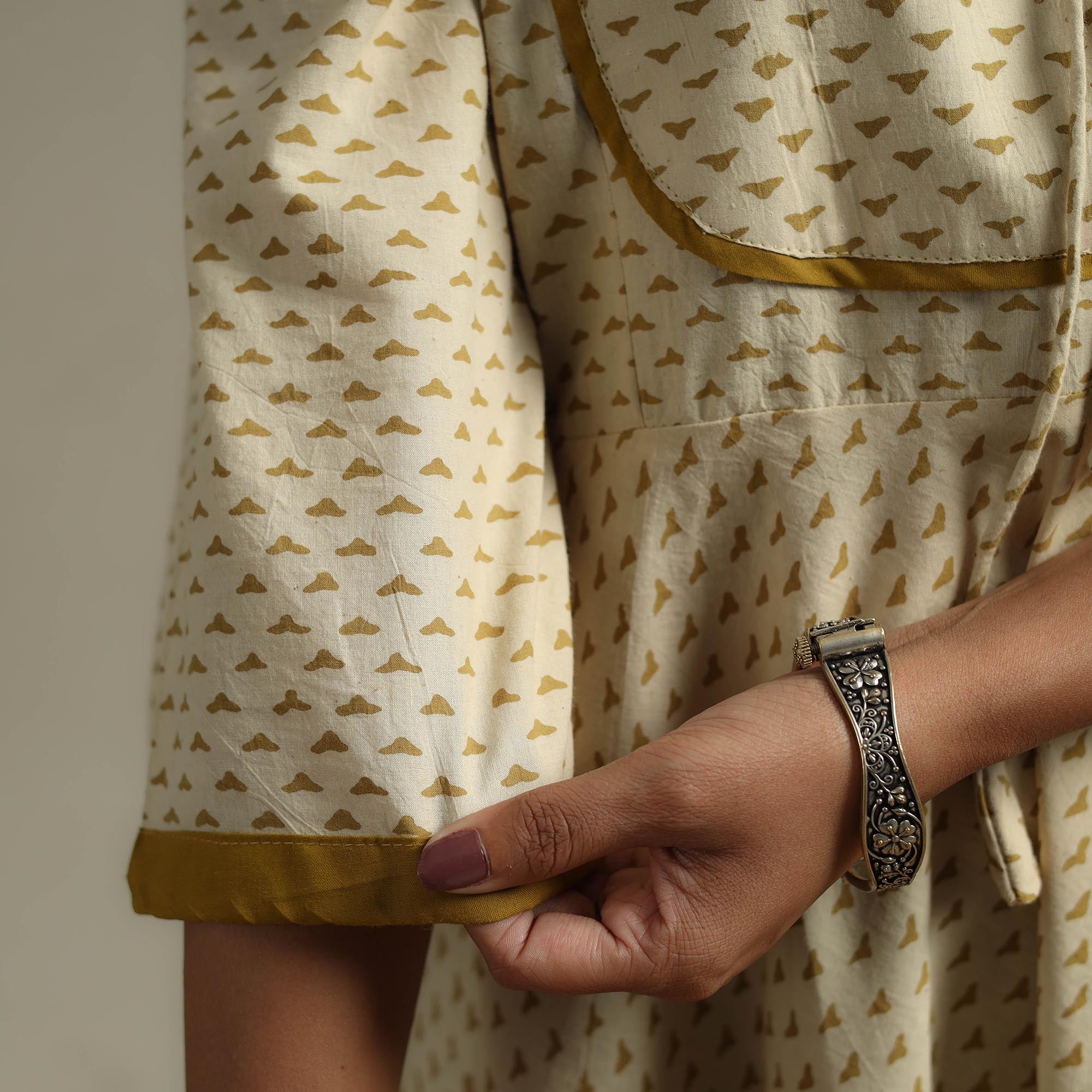 Beige ajrakh pure cotton dress crafted using natural dyeing and resist block-printing techniques. This ancient craft is estimated to be around 4,500 years old. Its front dori neck and flared design gives it a refined, elegant look. Comfortable and easy to wear, it’s ideal for relaxed homewear, casual outings, thoughtful gifting and even wearing on special days.