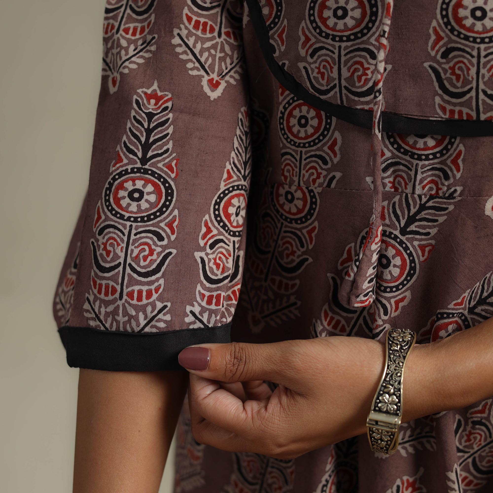 Brown ajrakh pure cotton dress crafted using natural dyeing and resist block-printing techniques. This ancient craft is estimated to be around 4,500 years old. Its front dori neck and flared design gives it a refined, elegant look. Comfortable and easy to wear, it’s ideal for relaxed homewear, casual outings, thoughtful gifting and even wearing on special days.
