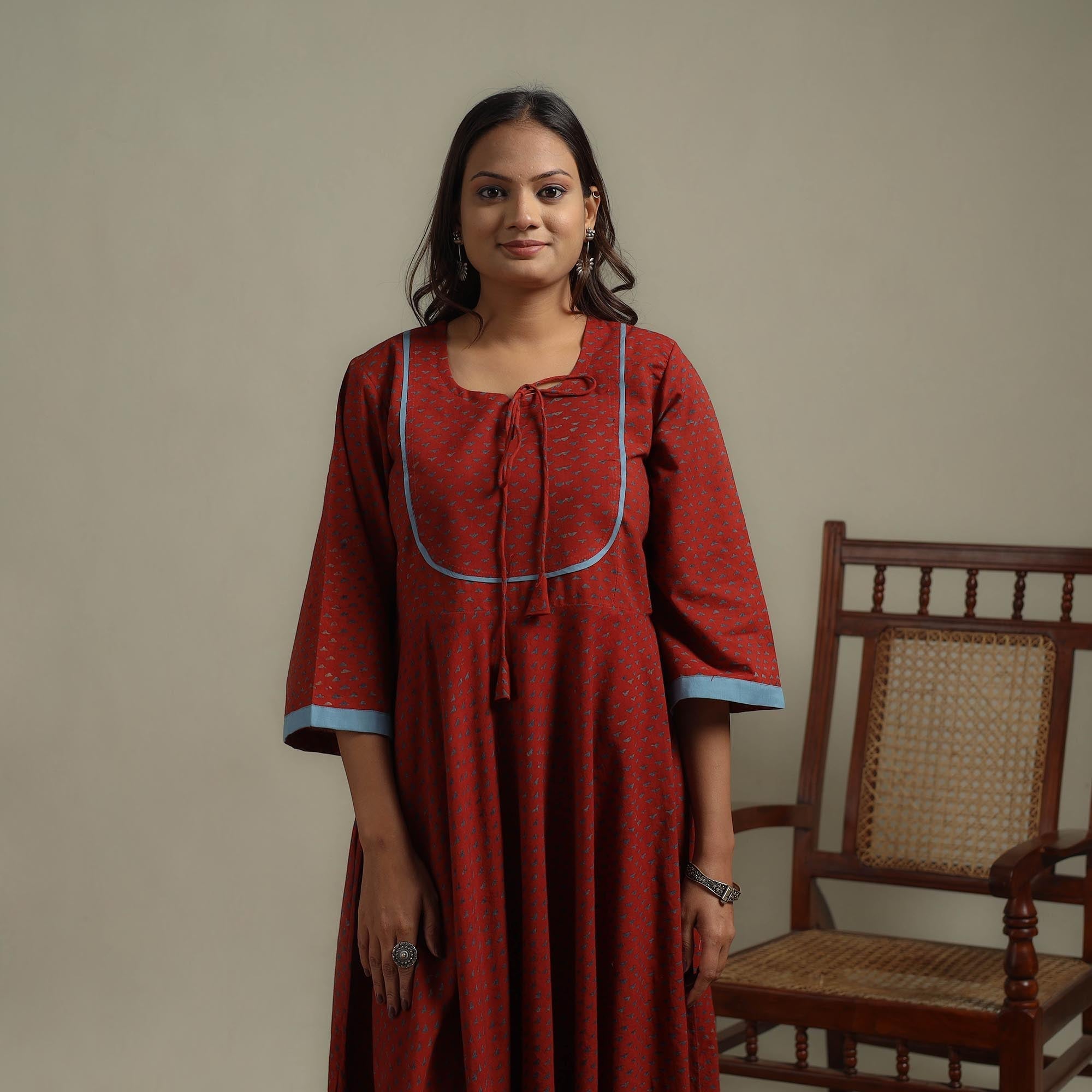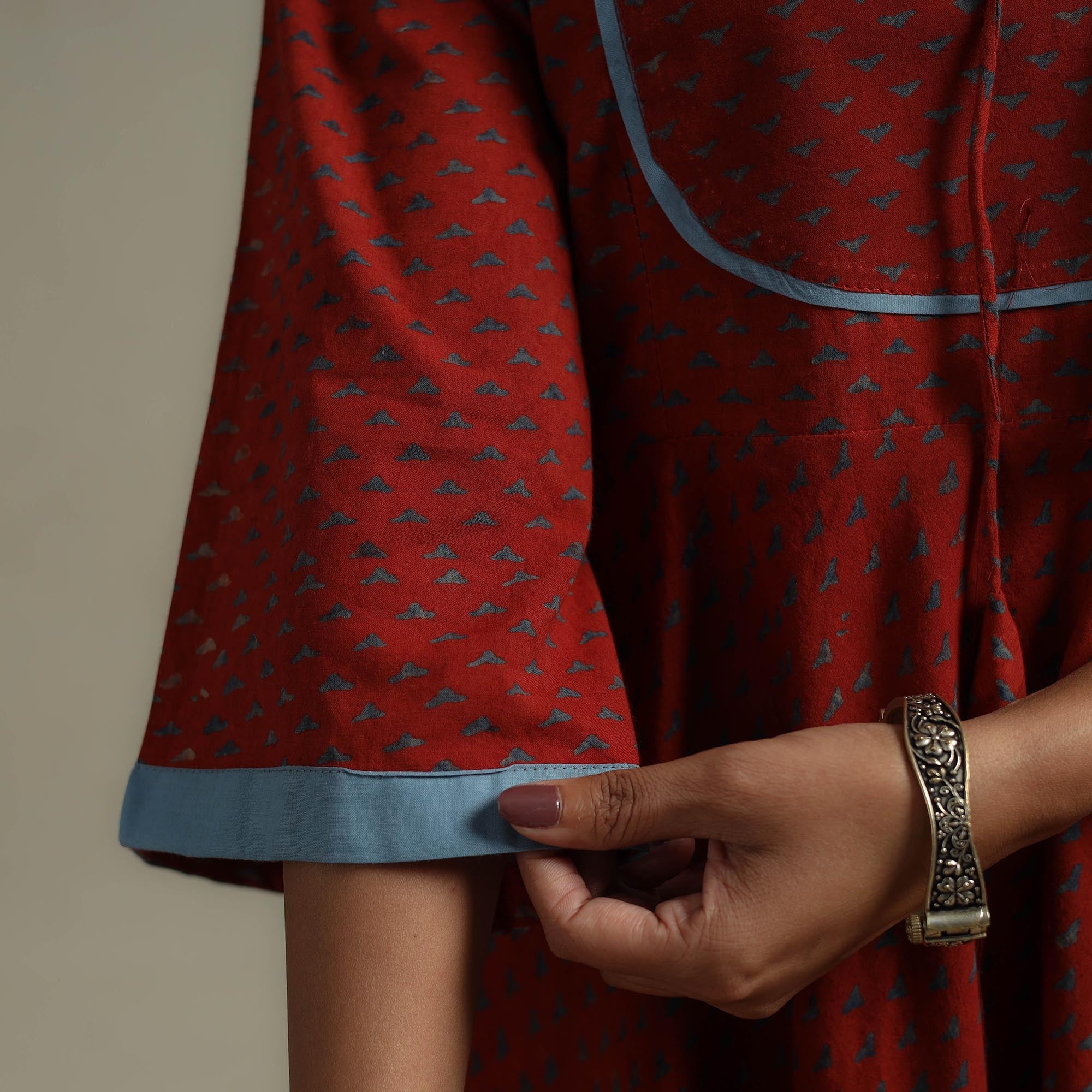 Red ajrakh pure cotton dress crafted using natural dyeing and resist block-printing techniques. This ancient craft is estimated to be around 4,500 years old. Its front dori neck and flared design gives it a refined, elegant look. Comfortable and easy to wear, it’s ideal for relaxed homewear, casual outings, thoughtful gifting and even wearing on special days.