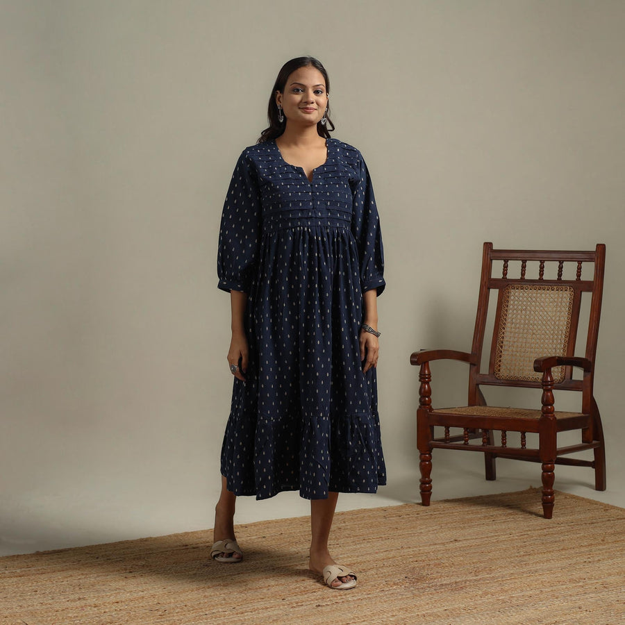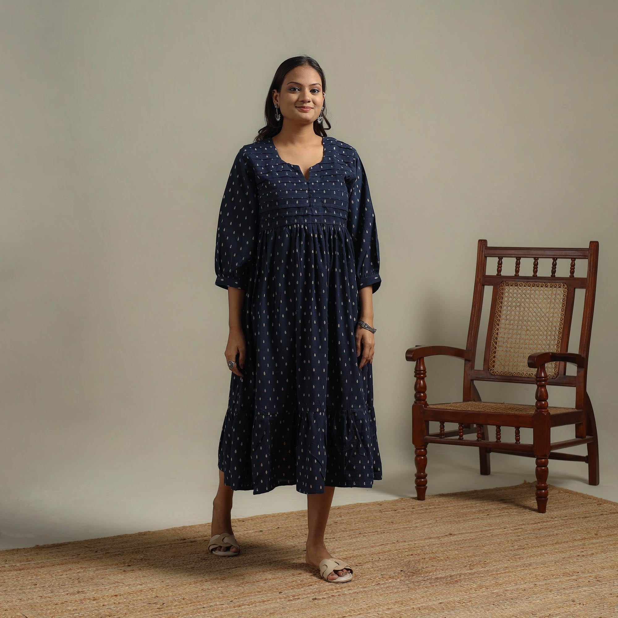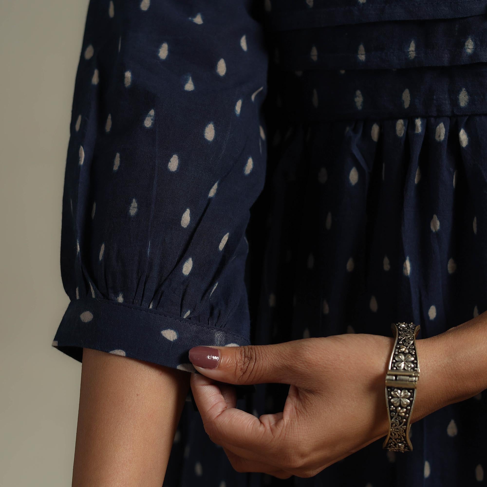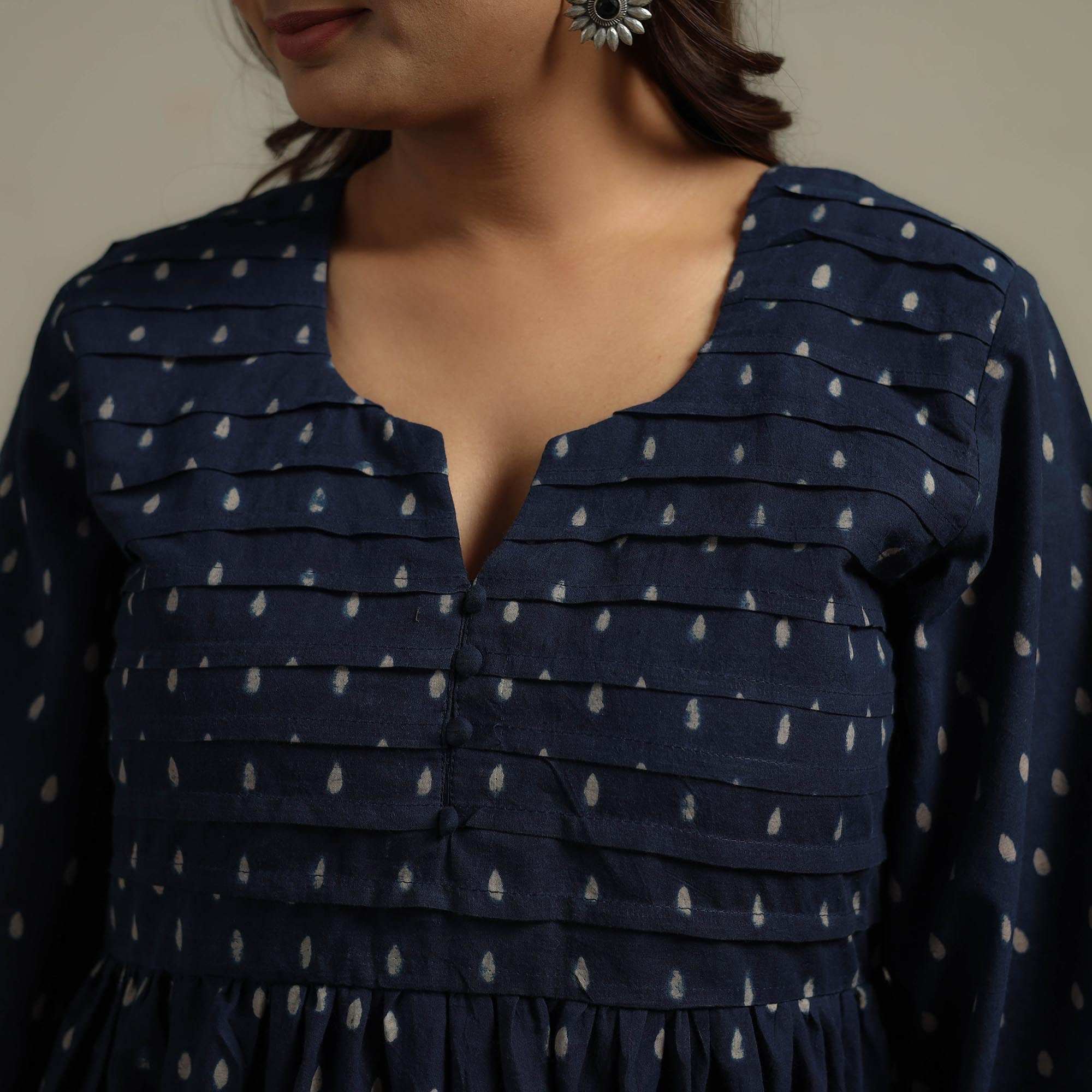 Blue ajrakh pure cotton dress crafted using natural dyeing and resist block-printing techniques. This ancient craft is estimated to be around 4,500 years old. Its tiered and pintuck design gives it a refined, elegant look. Comfortable and easy to wear, it’s ideal for relaxed homewear, casual outings, thoughtful gifting, and even wearing on special days.