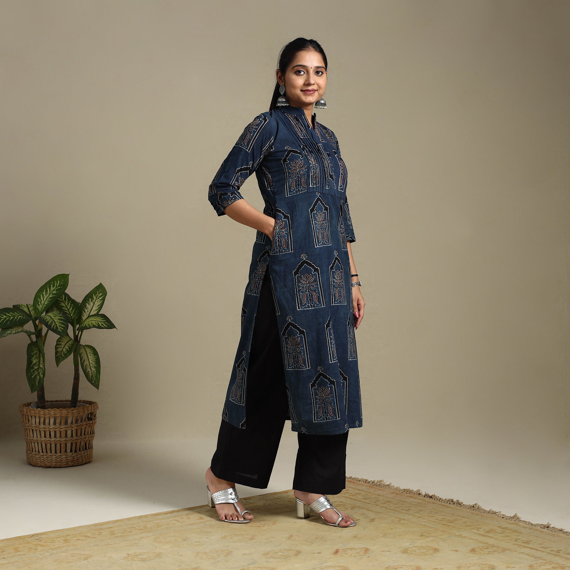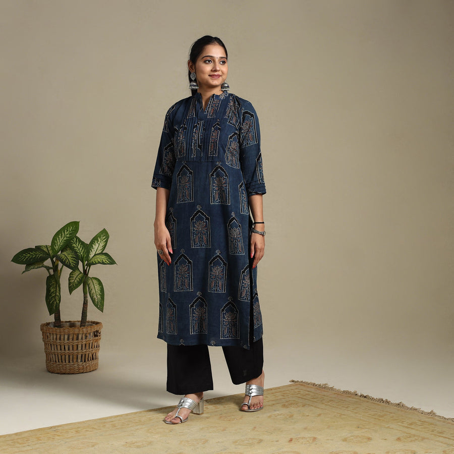 Step into effortless elegance with this blue block-printed cotton straight Ajrakh kurta. Crafted using naturally dyed fabric through the traditional Ajrakh hand block printing method, this kurta merges rich heritage with everyday style. The breathable cotton fabric ensures day-long comfort, and the addition of a functional side pocket adds a practical touch making it ideal for relaxed outings or festive occasions.