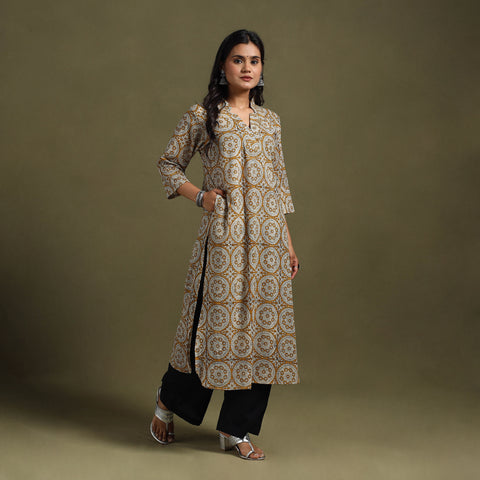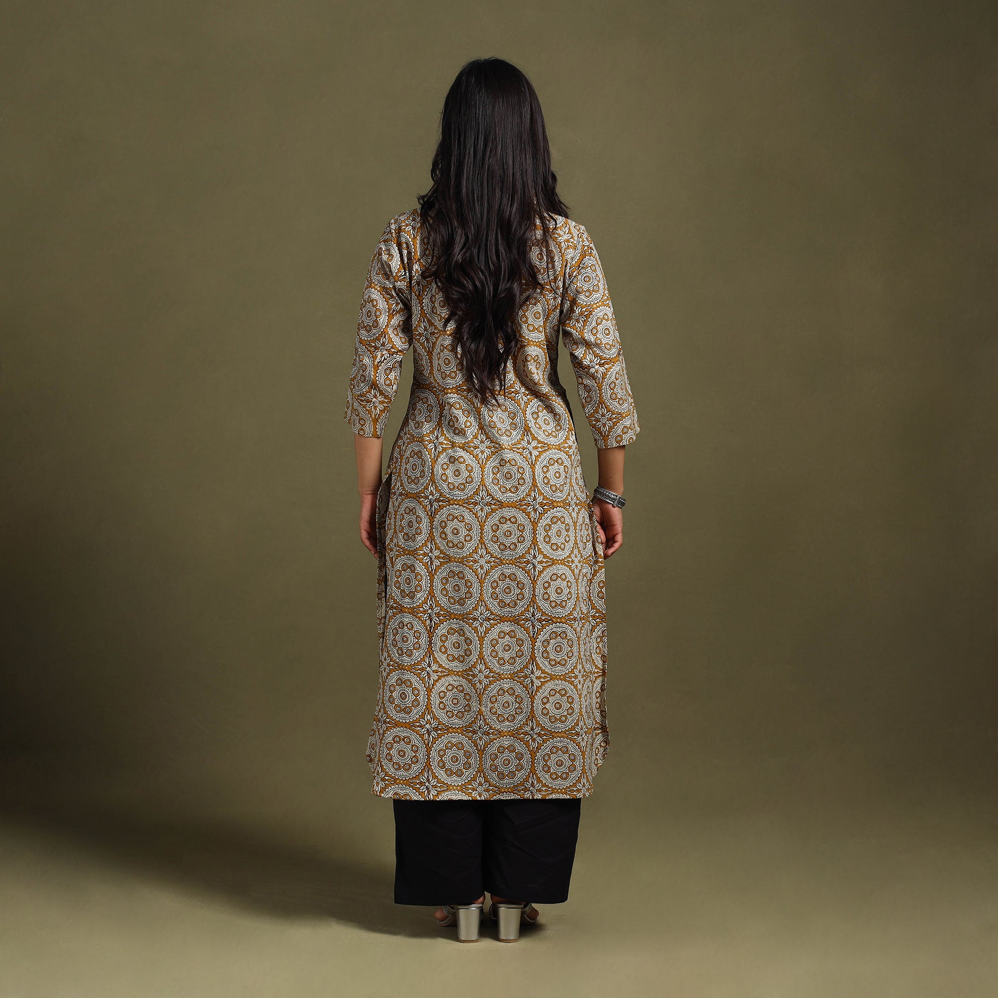 This yellow bagru hand block printed kurta is crafted from naturally dyed cotton fabric using the traditional mud-resist printing technique of Rajasthan. Intricate patterns are stamped by skilled artisans using finely carved wooden blocks. With a functional side pocket, this straight-fit kurta beautifully balances everyday comfort and timeless style. The breathable cotton fabric makes it perfect for all-day wear, no matter the occasion.