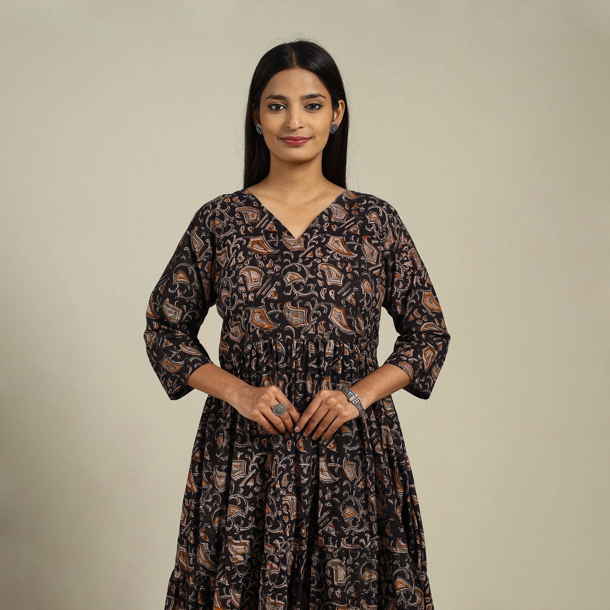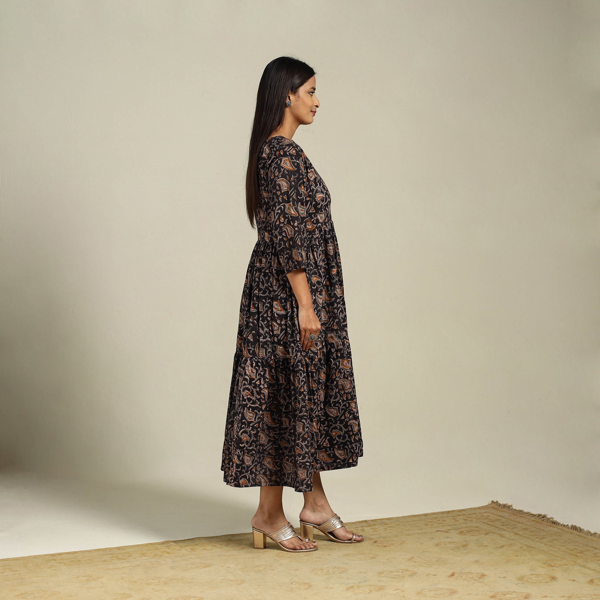 This black block-printed kalamkari dress is a perfect blend of style and comfort. Crafted from naturally dyed cotton fabric, it offers a soft, breathable feel against the skin. The uniquely tiered design provides a flattering silhouette. Whether worn for casual outings, family gatherings, or relaxed celebrations, this dress is a versatile and elegant addition to your wardrobe.