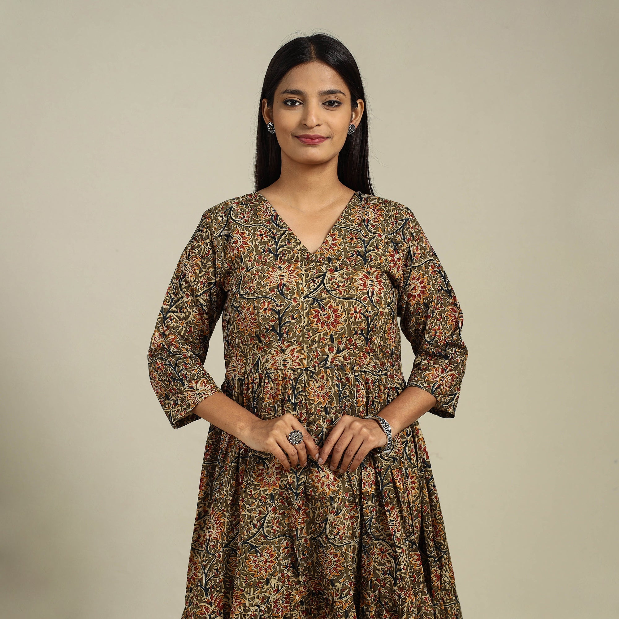 This green block-printed kalamkari dress is a perfect blend of style and comfort. Crafted from naturally dyed cotton fabric, it offers a soft, breathable feel against the skin. The uniquely tiered design provides a flattering silhouette. Whether worn for casual outings, family gatherings, or relaxed celebrations, this dress is a versatile and elegant addition to your wardrobe.
