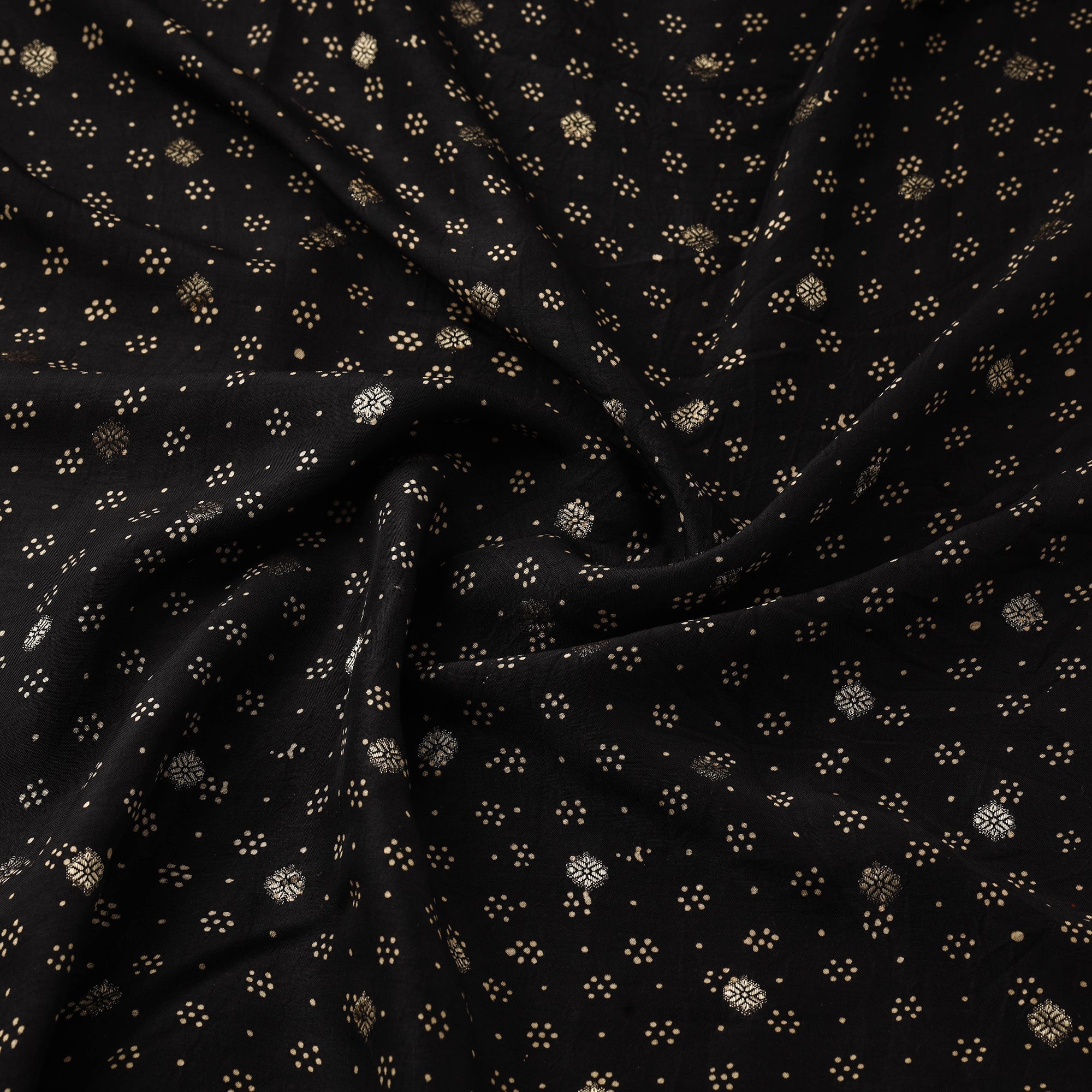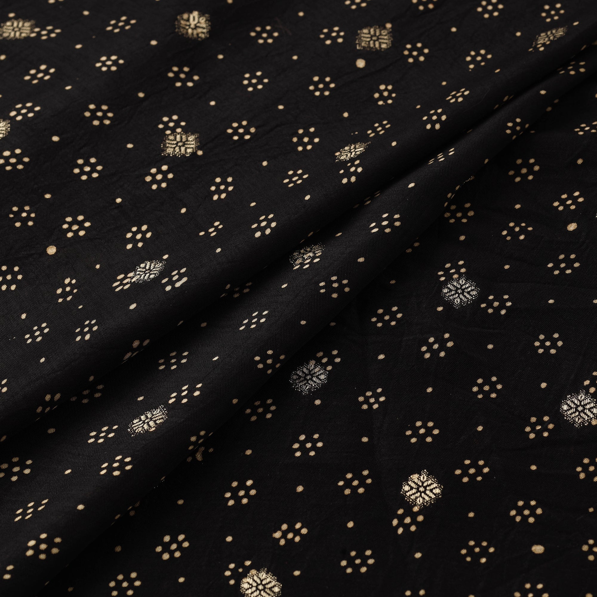 Black ajrakh fabric crafted using natural-dyeing and resist block-printing techniques. This ancient craft is estimated to be around 4,500 years old. The Ajrakh artisans in India originally migrated from Sindh to the Kutch region of Gujarat and to Barmer in Rajasthan. Ajrakh is also the traditional attire of the Maldhari pastoral community of Bhuj. The process is long and detailed, involving multiple stages where each layer of colour is printed only after a resting period, allowing the cloth to absorb the dye fully. Made from dola art silk adorned with jacquard buti, this blended fabric has a gentle shine, making it ideal for creating kurtas, shirts, dresses or even home decor items.
