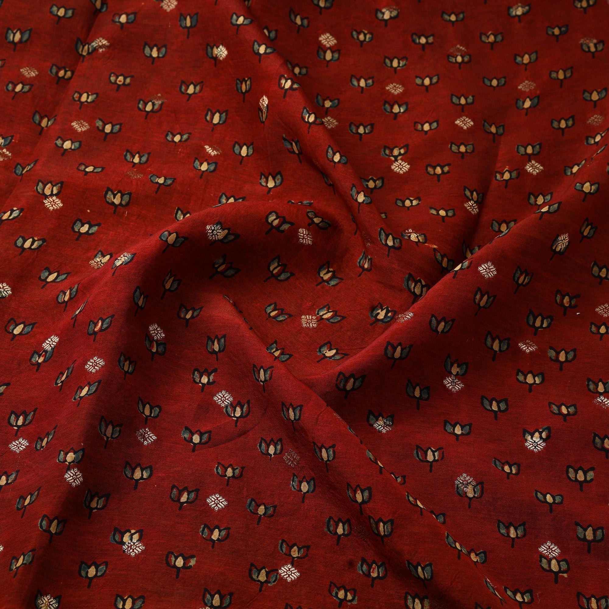 Red ajrakh fabric crafted using natural-dyeing and resist block-printing techniques. This ancient craft is estimated to be around 4,500 years old. The Ajrakh artisans in India originally migrated from Sindh to the Kutch region of Gujarat and to Barmer in Rajasthan. Ajrakh is also the traditional attire of the Maldhari pastoral community of Bhuj. The process is long and detailed, involving multiple stages where each layer of colour is printed only after a resting period, allowing the cloth to absorb the dye fully. Made from dola art silk adorned with jacquard buti, this blended fabric has a gentle shine, making it ideal for creating kurtas, shirts, dresses or even home decor items.