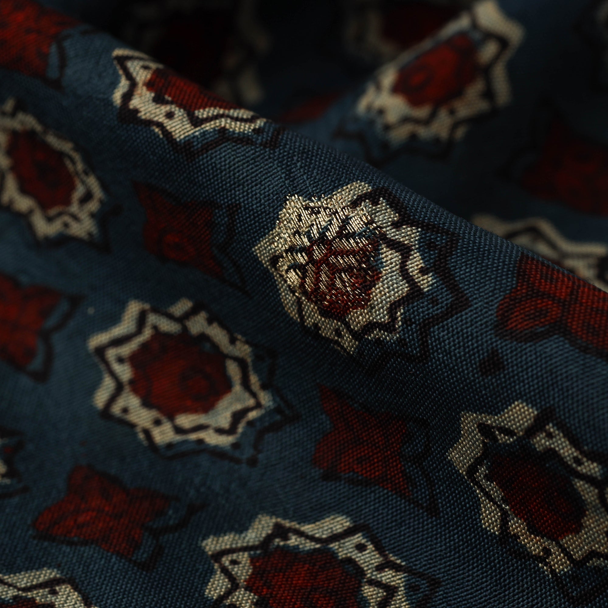 Blue ajrakh fabric crafted using natural-dyeing and resist block-printing techniques. This ancient craft is estimated to be around 4,500 years old. The Ajrakh artisans in India originally migrated from Sindh to the Kutch region of Gujarat and to Barmer in Rajasthan. Ajrakh is also the traditional attire of the Maldhari pastoral community of Bhuj. The process is long and detailed, involving multiple stages where each layer of colour is printed only after a resting period, allowing the cloth to absorb the dye fully. Made from dola art silk adorned with jacquard buti, this blended fabric has a gentle shine, making it ideal for creating kurtas, shirts, dresses or even home decor items.