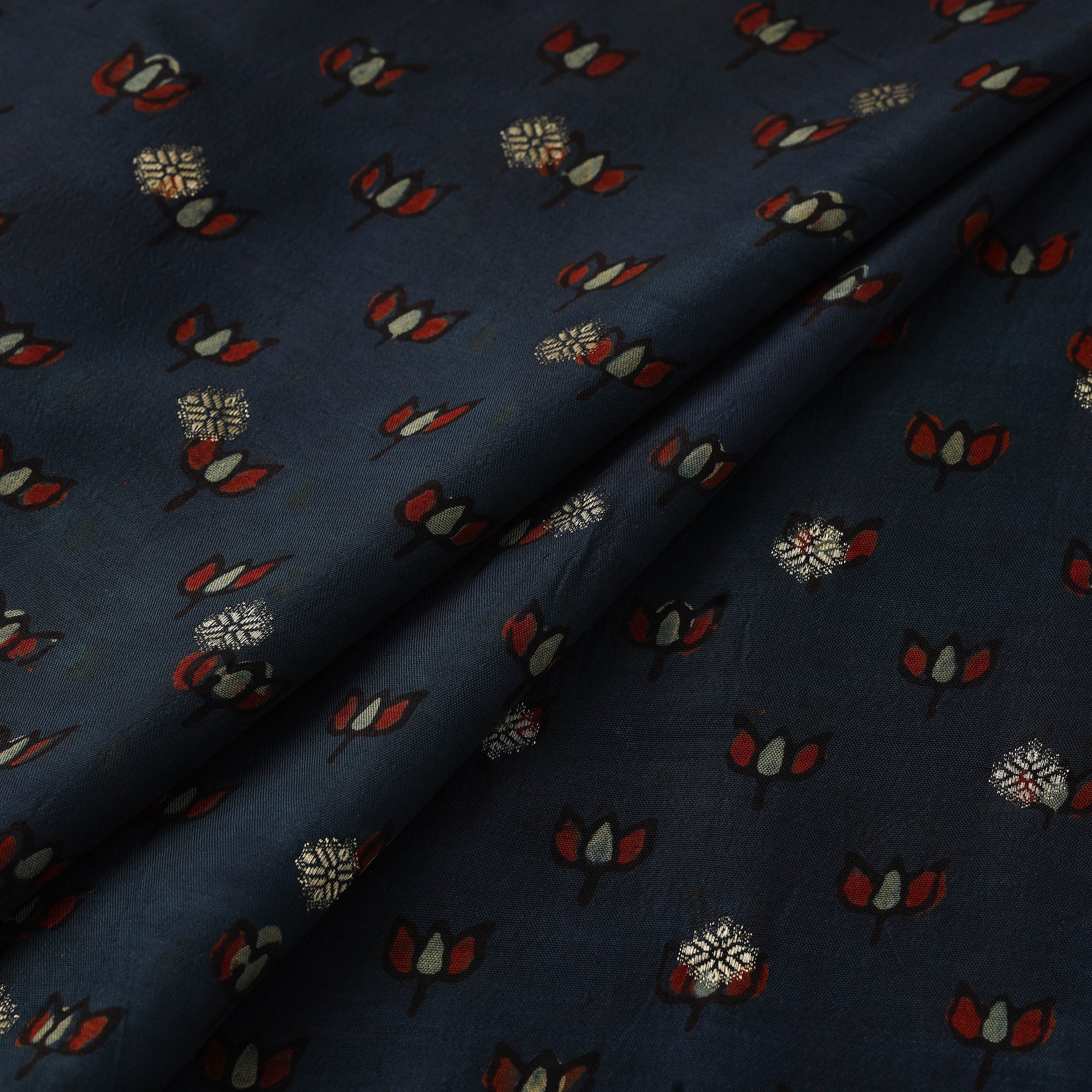 Blue ajrakh fabric crafted using natural-dyeing and resist block-printing techniques. This ancient craft is estimated to be around 4,500 years old. The Ajrakh artisans in India originally migrated from Sindh to the Kutch region of Gujarat and to Barmer in Rajasthan. Ajrakh is also the traditional attire of the Maldhari pastoral community of Bhuj. The process is long and detailed, involving multiple stages where each layer of colour is printed only after a resting period, allowing the cloth to absorb the dye fully. Made from dola art silk adorned with jacquard buti, this blended fabric has a gentle shine, making it ideal for creating kurtas, shirts, dresses or even home decor items.