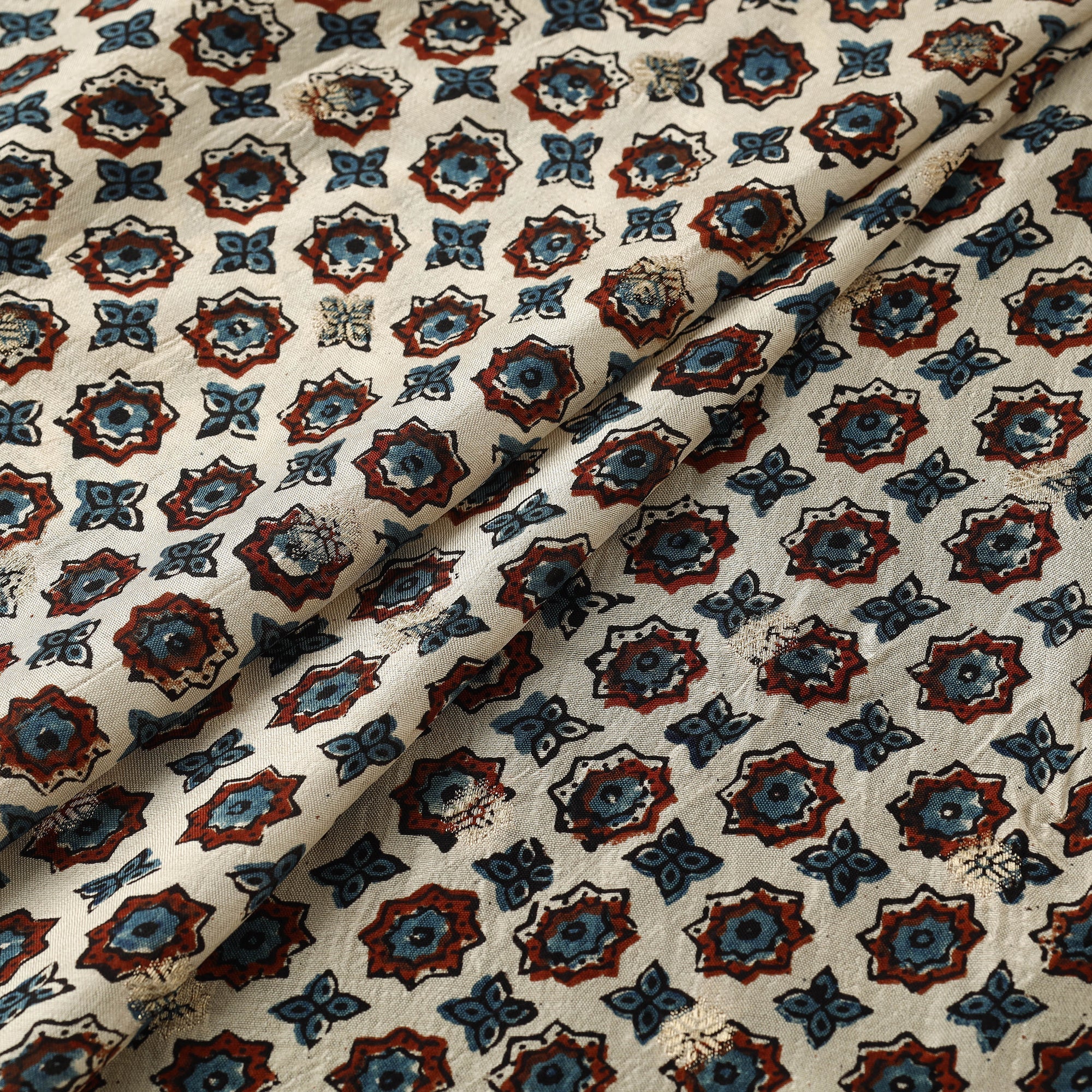 Beige - Block Print Natural Dyed Dola Silk Jacquard Buti Ajrakh Fabric 11