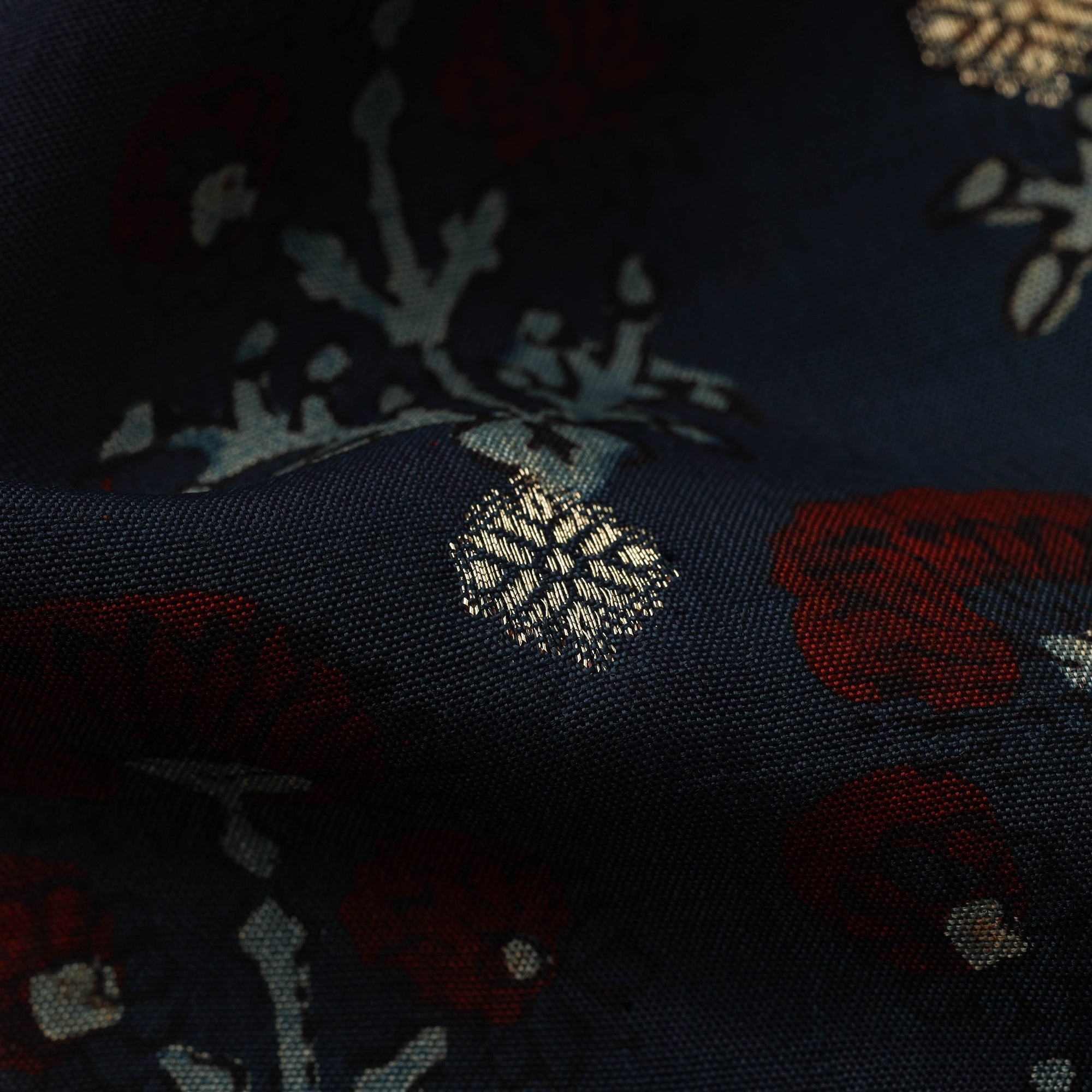 Ajrakh fabric crafted using natural-dyeing and resist block-printing techniques. This ancient craft is estimated to be around 4,500 years old. The Ajrakh artisans in India originally migrated from Sindh to the Kutch region of Gujarat and to Barmer in Rajasthan. Ajrakh is also the traditional attire of the Maldhari pastoral community of Bhuj. The process is long and detailed, involving multiple stages where each layer of colour is printed only after a resting period, allowing the cloth to absorb the dye fully. Made from dola art silk adorned with jacquard buti, this blended fabric has a gentle shine, making it ideal for creating kurtas, shirts, dresses or even home decor items.