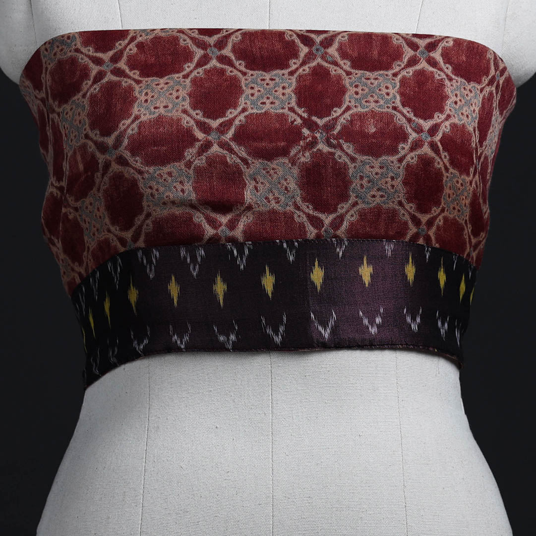 Stay warm with our red block print woollen ajrakh blouse piece. Handcrafted from traditional ajrakh wool textiles, it showcases intricate block print. Perfect for winter wear, this blouse effortlessly combines comfort with unique cultural artistry.