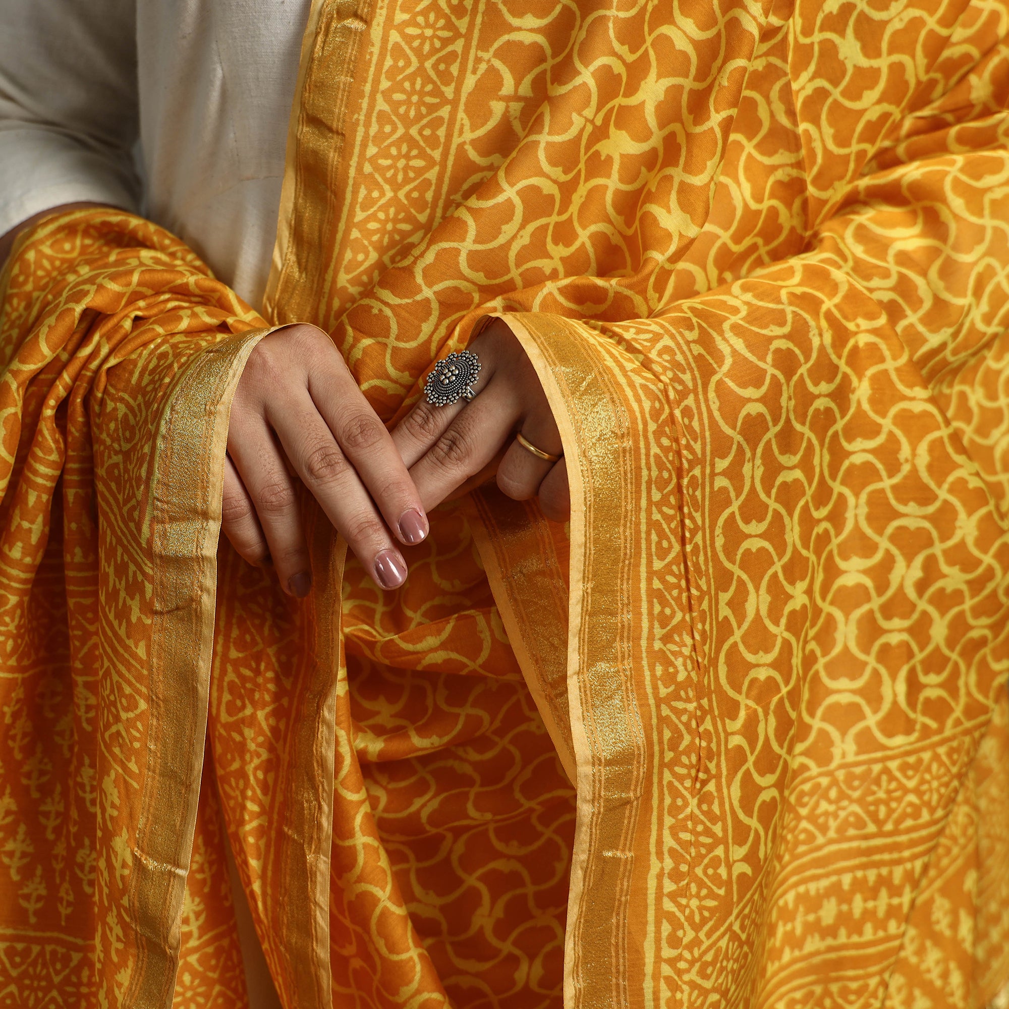 Experience the charm of this orange block-printed chanderi silk bagru dupatta with zari border. Made using the mud resist technique and rapid colors, artisans create beautiful bagru prints that beautifully combine cultural artistry with modern elegance. This dupatta ideal for both casual and festive occasions