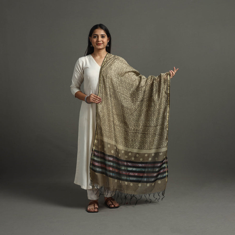 Experience the charm of this green block-printed chanderi silk bagru dupatta with zari border. Made using the mud resist technique and rapid colors, artisans create beautiful bagru prints that beautifully combine cultural artistry with modern elegance. This dupatta ideal for both casual and festive occasions