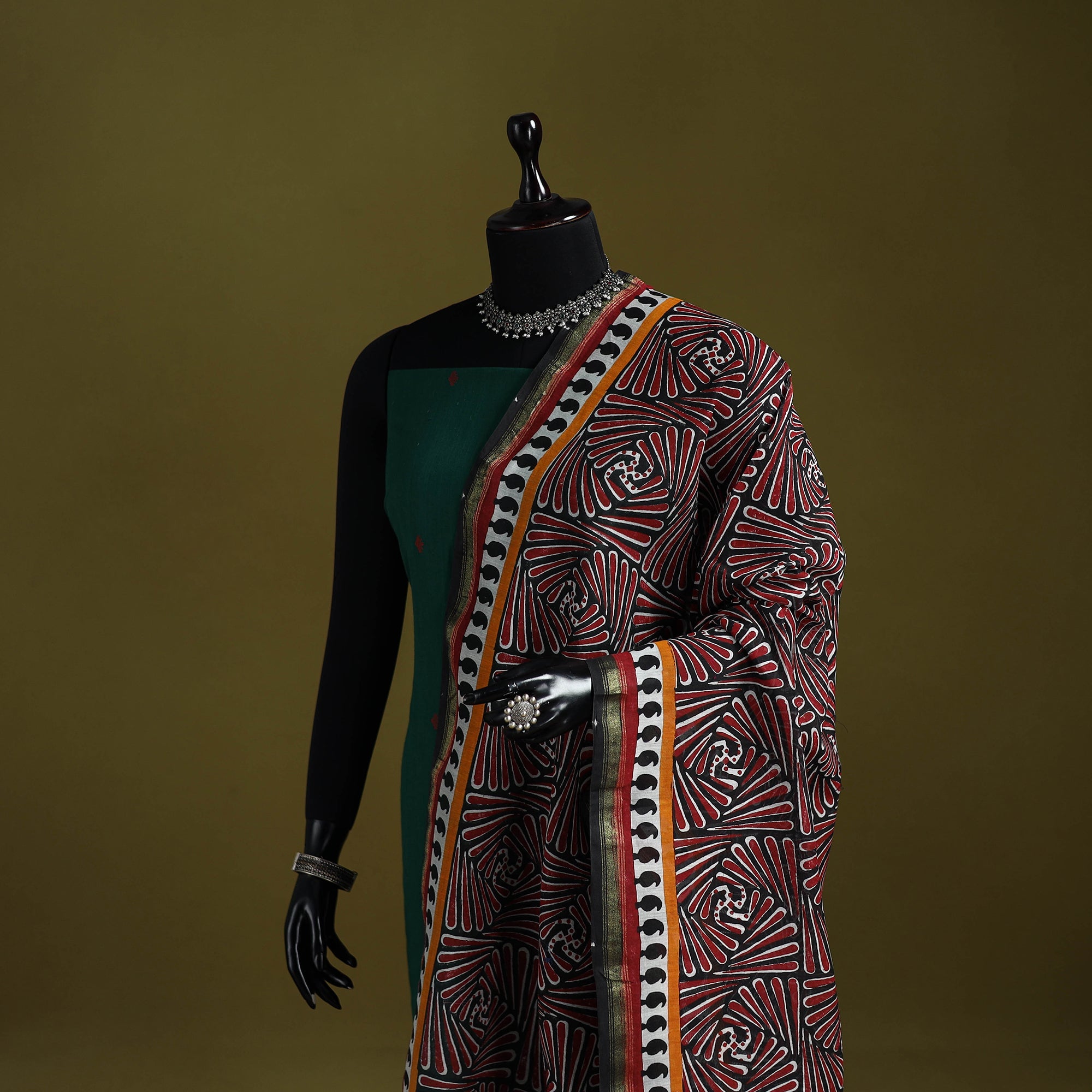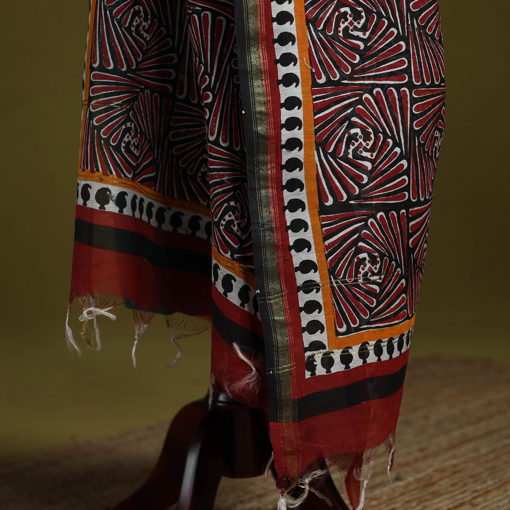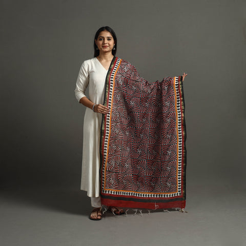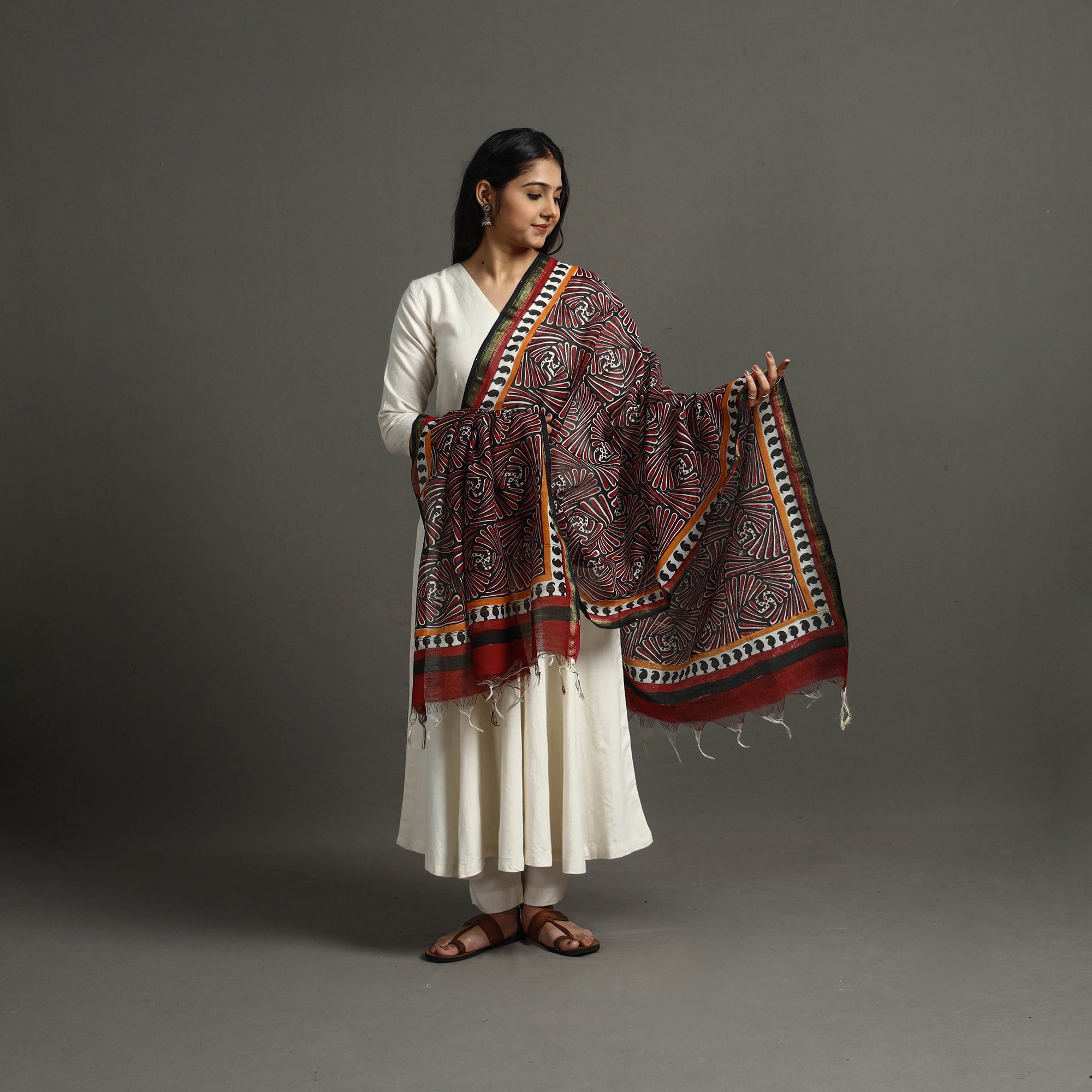 Experience the charm of this red block-printed chanderi silk bagru dupatta with zari border. Made using the mud resist technique and rapid colors, artisans create beautiful bagru prints that beautifully combine cultural artistry with modern elegance. This dupatta ideal for both casual and festive occasions