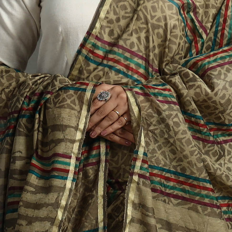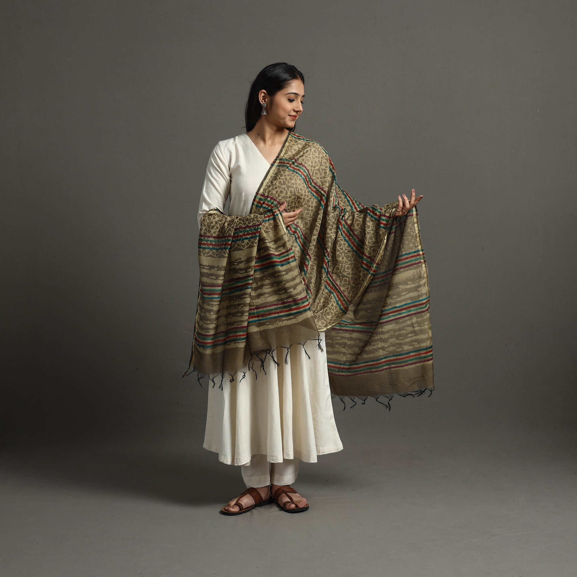 Experience the charm of this green block-printed chanderi silk bagru dupatta with zari border. Made using the mud resist technique and rapid colors, artisans create beautiful bagru prints that beautifully combine cultural artistry with modern elegance. This dupatta ideal for both casual and festive occasions