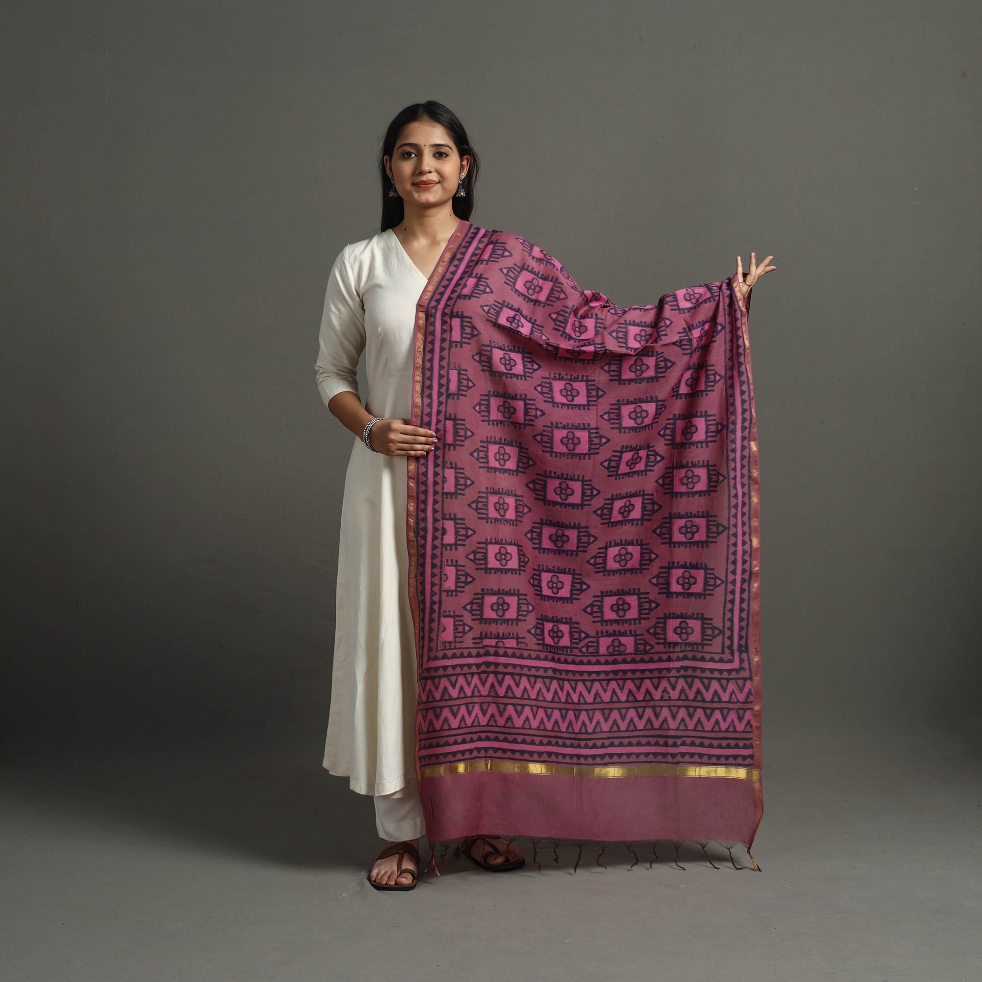 Experience the charm of this purple block-printed chanderi silk bagru dupatta with zari border. Made using the mud resist technique and rapid colors, artisans create beautiful bagru prints that beautifully combine cultural artistry with modern elegance. This dupatta ideal for both casual and festive occasions