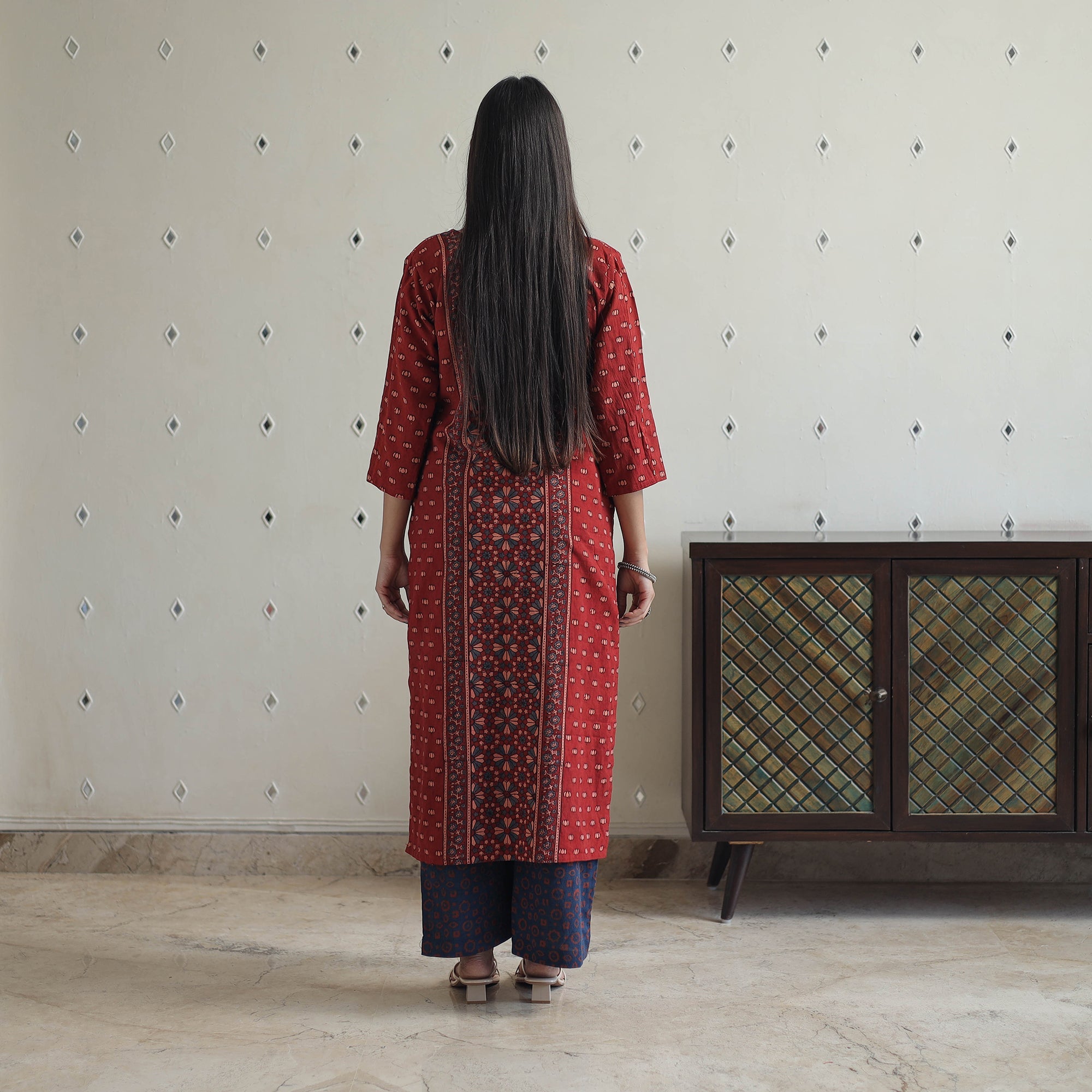 Embrace the timeless beauty of the block-printed cotton ajrakh kurta set, featuring a hand-block-printed kurta, comfortable palazzo, and matching dupatta. Crafted using natural dyes, The kurta has one side pocket, and the palazzo has two side pockets. Perfect for daily wear or festive occasions.