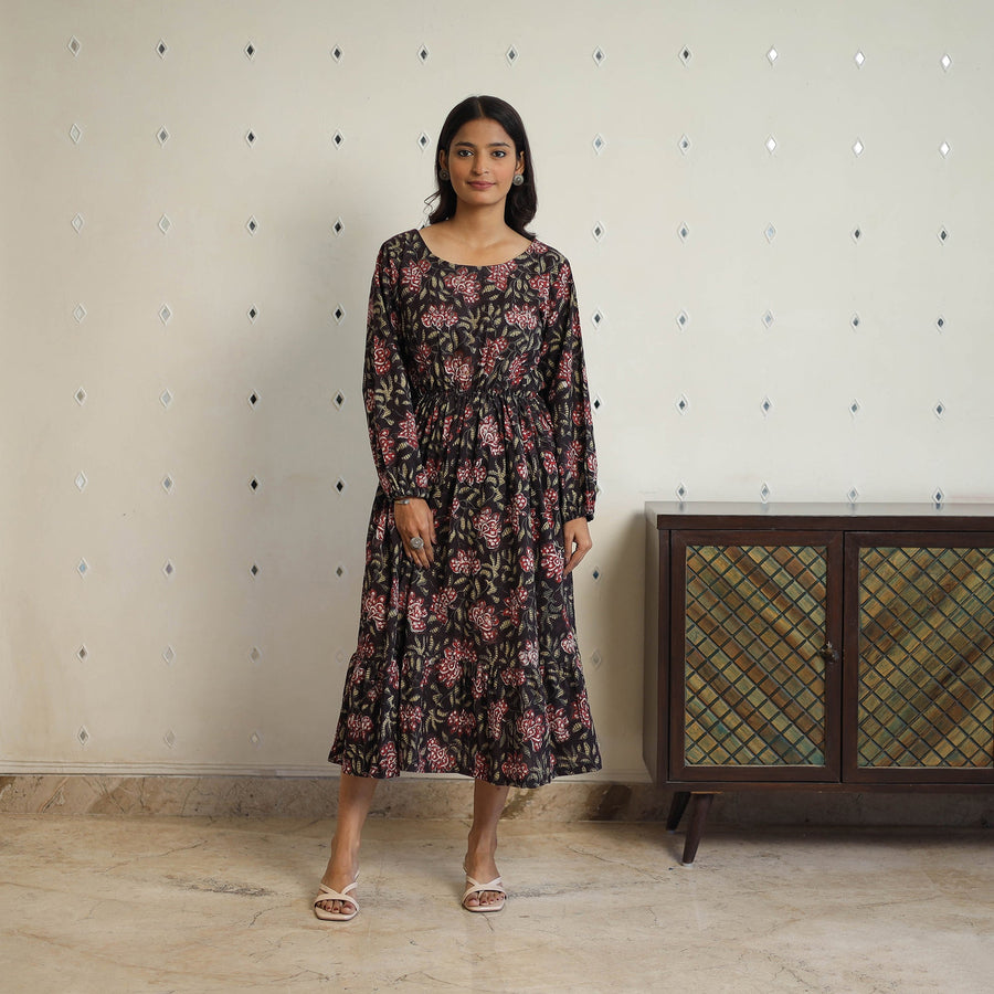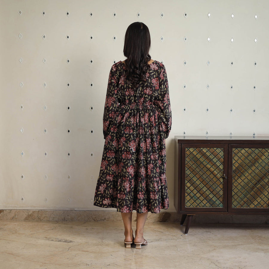 This black block printed cotton fit and flare jahota dress a testament to Indian craftsmanship. Made from breathable, soft cotton and featuring an elasticated waist for enhanced comfort this dress is as functional as it is stylish. The intricate art of jahota block printing, a centuries old technique using hand carved wooden blocks and natural dyes adorns the fabric with unique patterns that celebrate heritage and sustainability. Handcrafted by skilled artisans this dress is perfect for any occasion embodying elegance