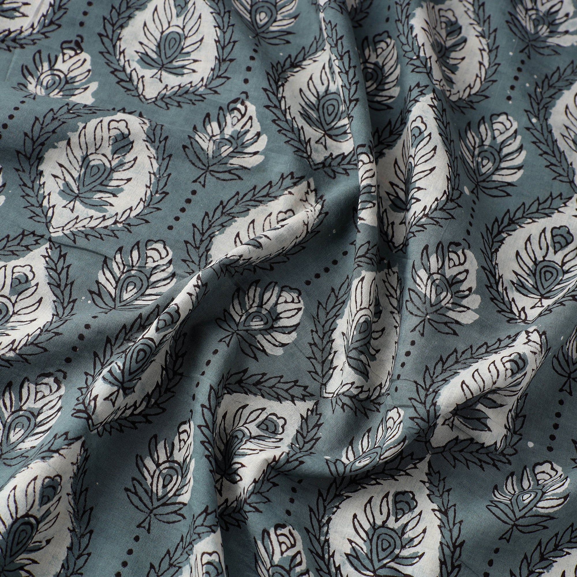The timeless charm of grey block printed cotton jahota fabric, created using traditional mud-resist techniques and natural dyes in the village of Jahota, Rajasthan. Each piece is crafted with hand-carved wooden blocks, preserving the artistry of skilled artisans.