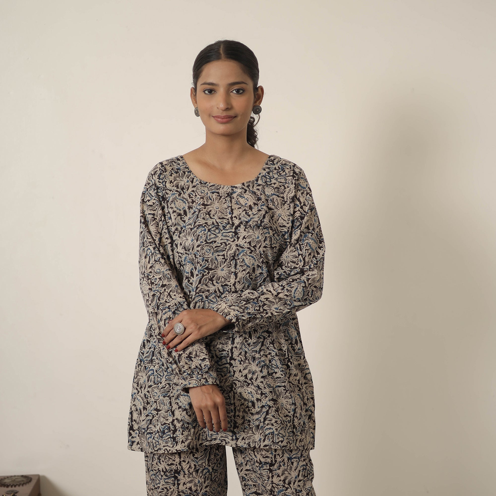 Stay comfortable and stylish with our black block printed cotton Kalamkari co-ord set, crafted using traditional hand block printing technique from Pedana. Made from natural dyed breathable cotton, this two-piece outfit features an elasticated waist palaazo and a stylish top. Each piece is naturally dyed, reflecting the heritage of Kalamkari artistry. Perfect for all-day comfort, this set supports local artisans.