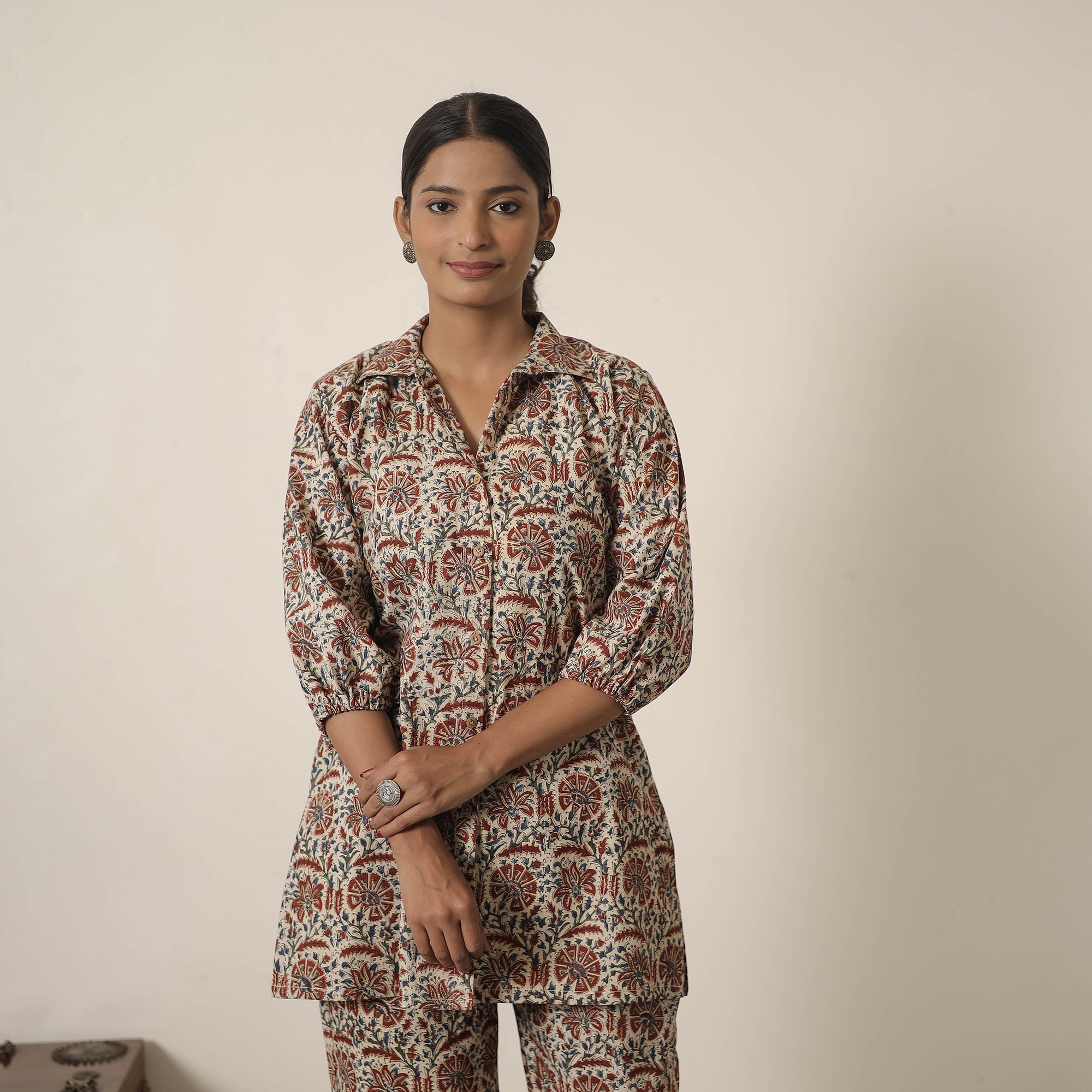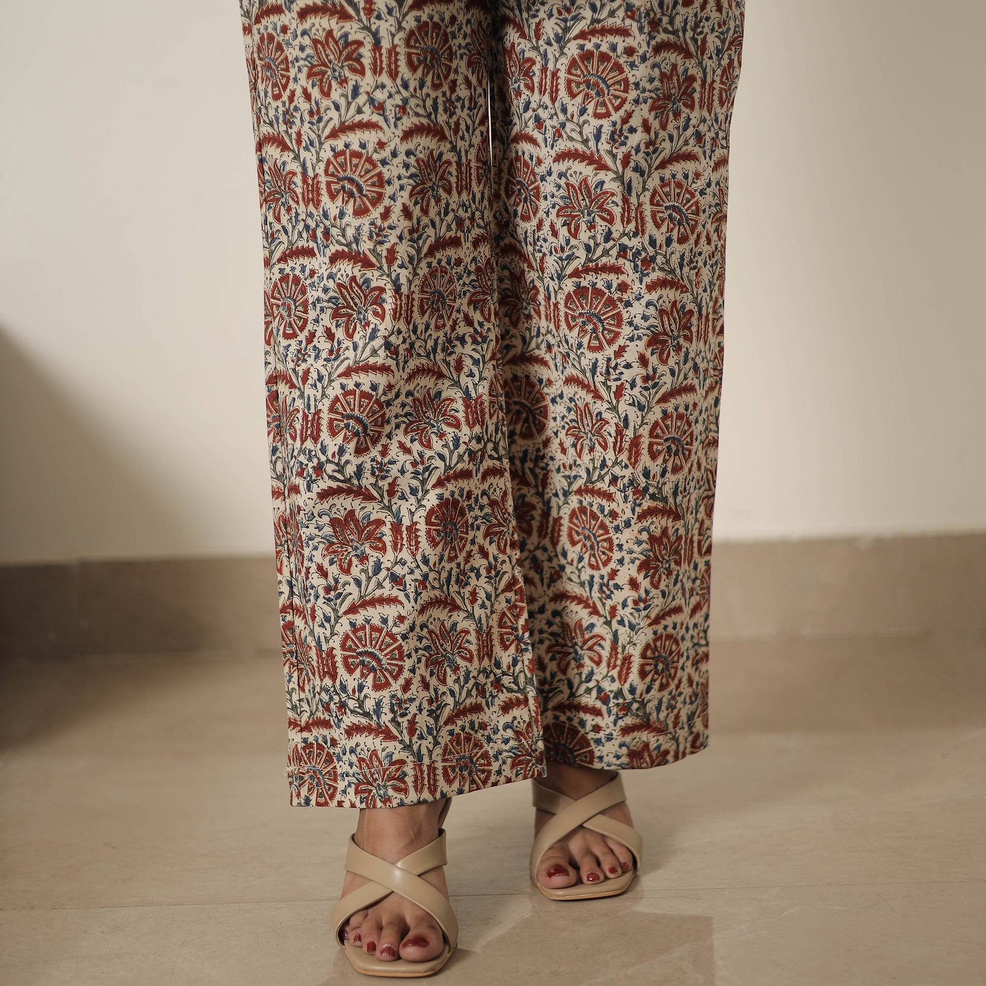 Stay comfortable and stylish with our beige block printed cotton Kalamkari co-ord set, crafted using traditional hand block printing technique from Pedana. Made from natural dyed breathable cotton, this two-piece outfit features an elasticated waist palaazo and a stylish top. Each piece is naturally dyed, reflecting the heritage of Kalamkari artistry. Perfect for all-day comfort, this set supports local artisans.