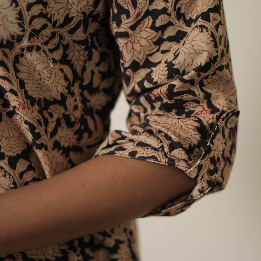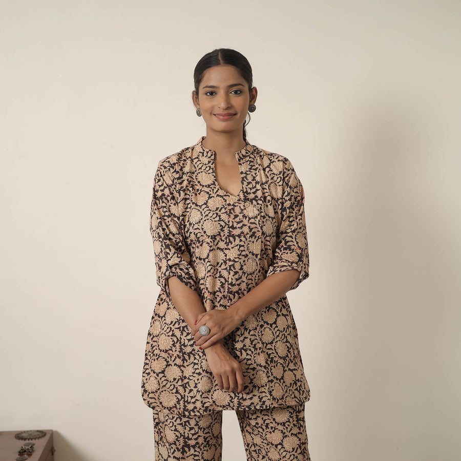 Stay comfortable and stylish with our beige block printed cotton Kalamkari co-ord set, crafted using traditional hand block printing technique from Pedana. Made from natural dyed breathable cotton, this two-piece outfit features an elasticated waist palaazo and a stylish top. Each piece is naturally dyed, reflecting the heritage of Kalamkari artistry. Perfect for all-day comfort, this set supports local artisans.