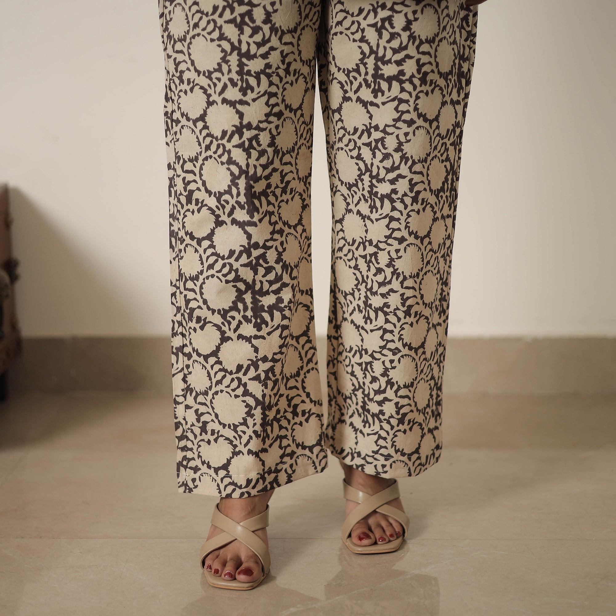Stay comfortable and stylish with our beige block printed cotton Kalamkari co-ord set, crafted using traditional hand block printing technique from Pedana. Made from natural dyed breathable cotton, this two-piece outfit features an elasticated waist palaazo and a stylish top. Each piece is naturally dyed, reflecting the heritage of Kalamkari artistry. Perfect for all-day comfort, this set supports local artisans.