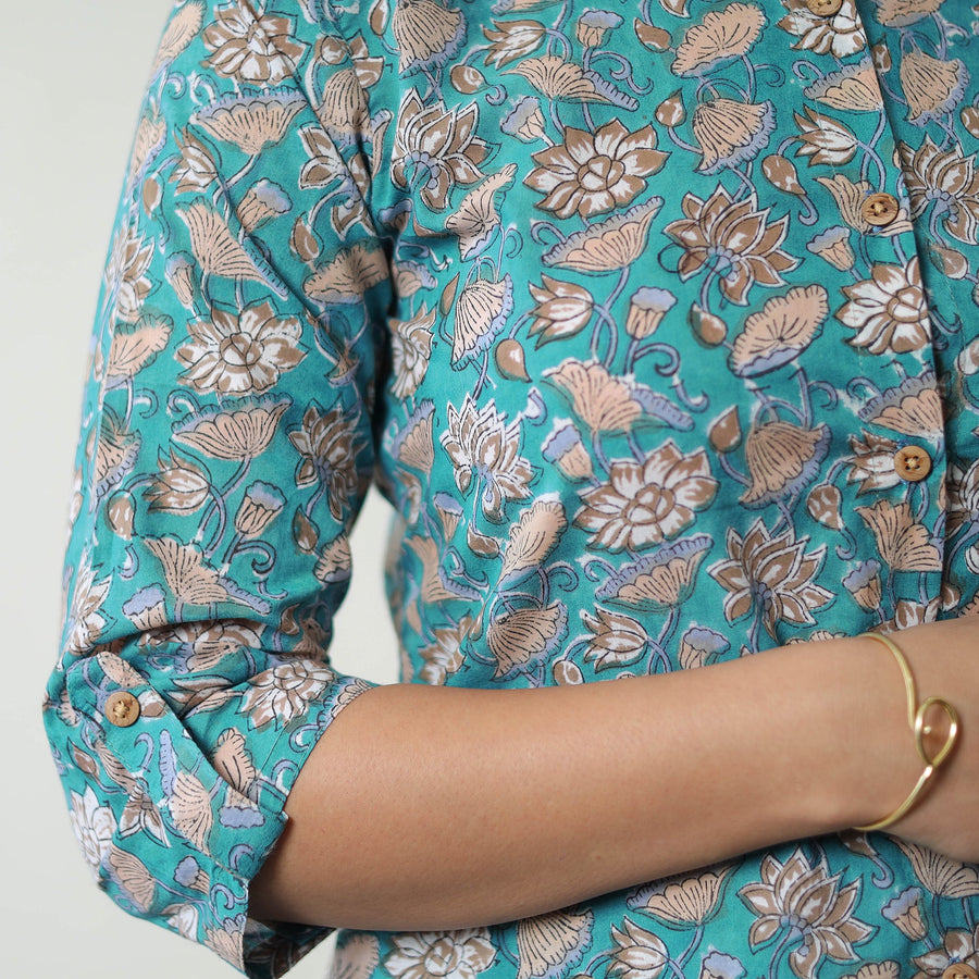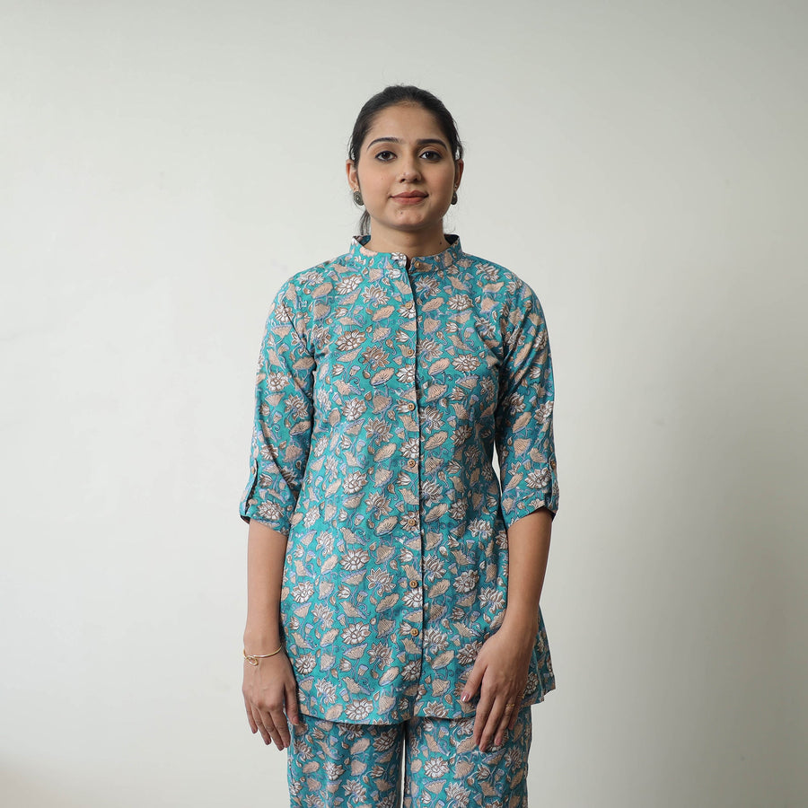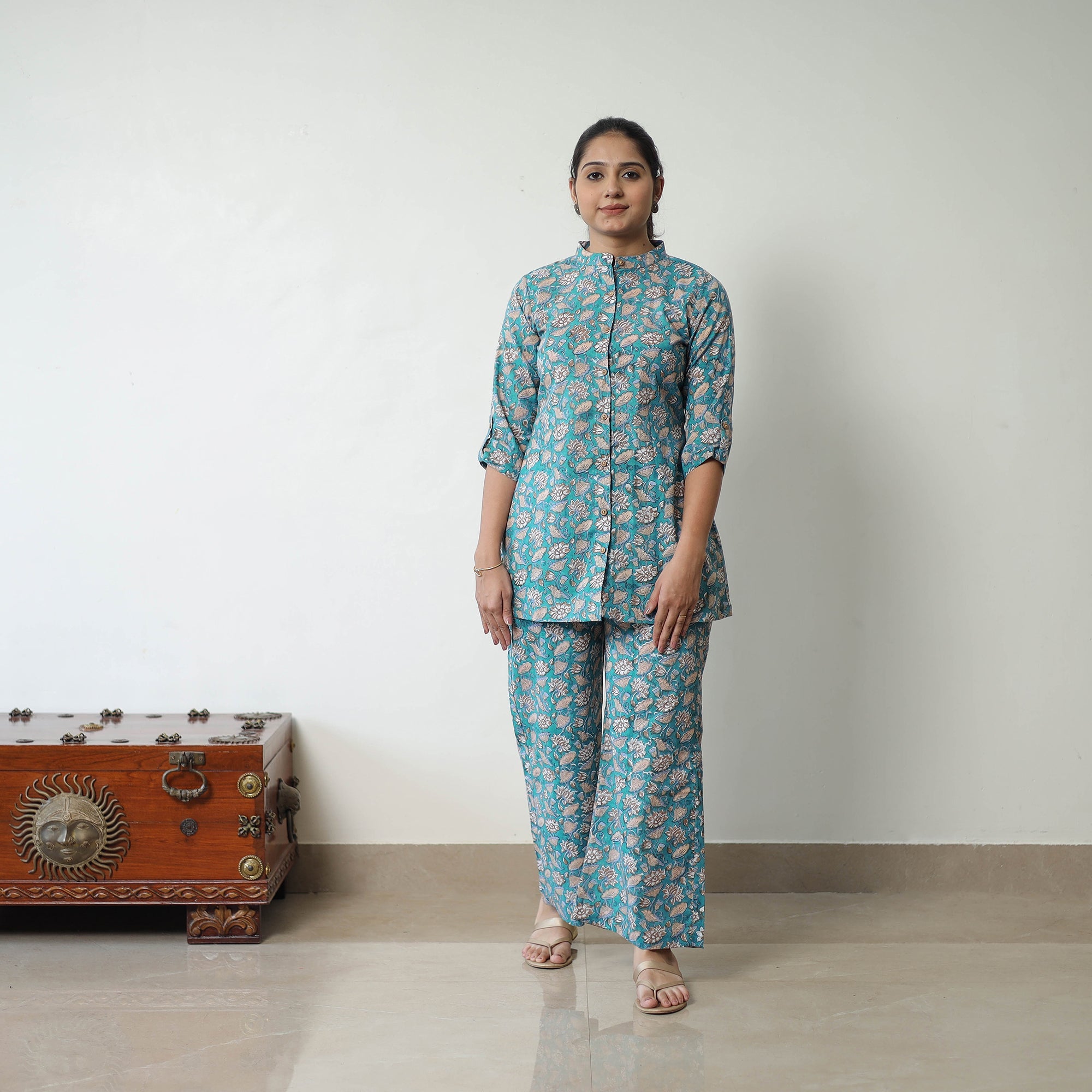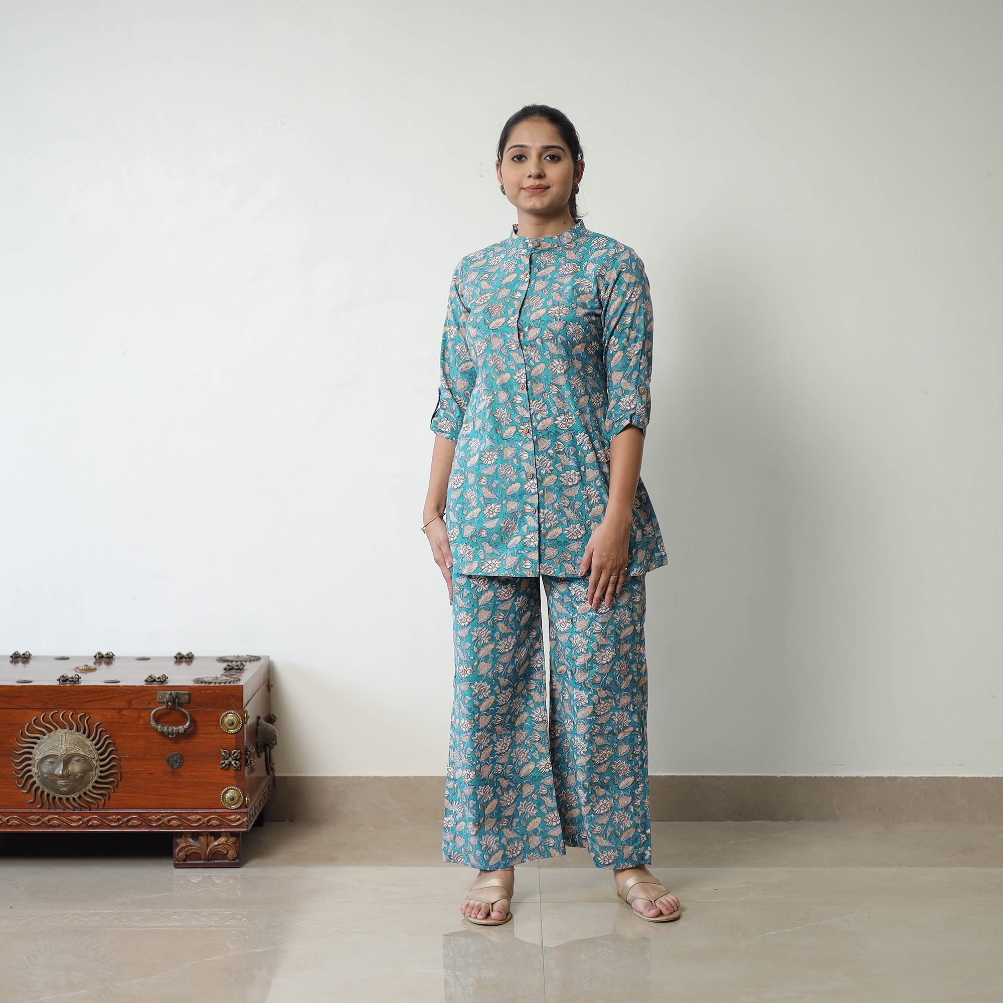 Stay comfortable and stylish with our green block printed cotton sanganeri co-ord set, featuring a beautiful two-piece design. Made from block-printed cotton fabric. The elasticized waist palazzo ensures a great fit, while the two side pockets add functionality to this palazzo. The unique design ensures a beautiful and comfortable fit.