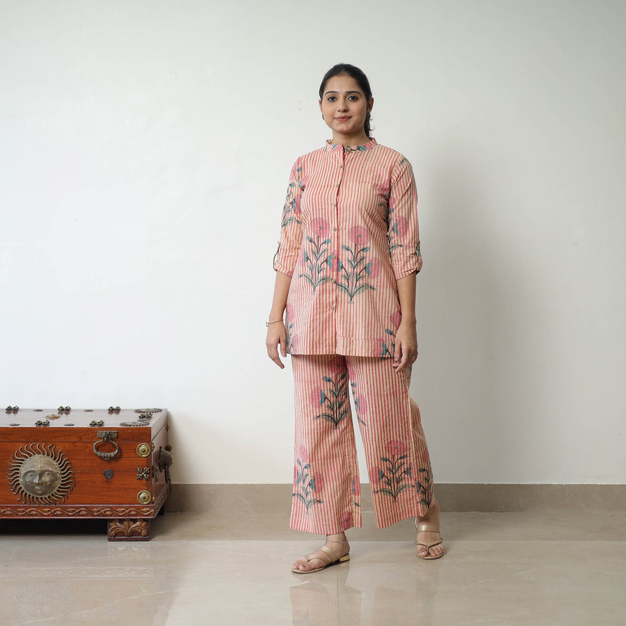 Stay comfortable and stylish with our peach block printed cotton sanganeri co-ord set, featuring a beautiful two-piece design. Made from block-printed cotton fabric. The elasticized waist palazzo ensures a great fit, while the two side pockets add functionality to this palazzo. The unique design ensures a beautiful and comfortable fit.