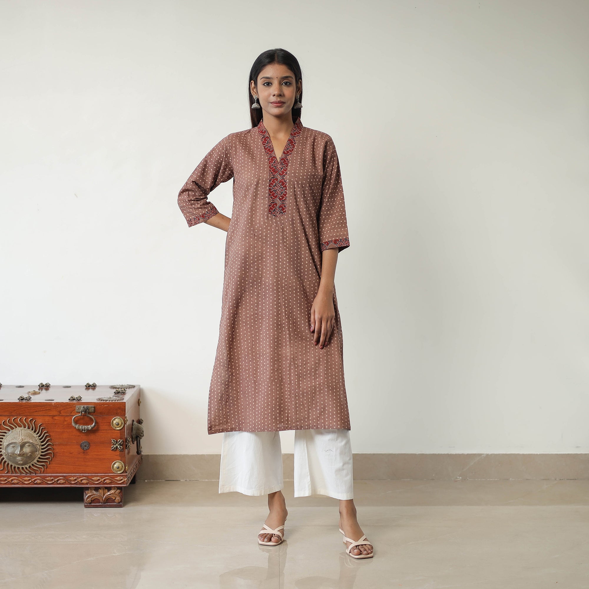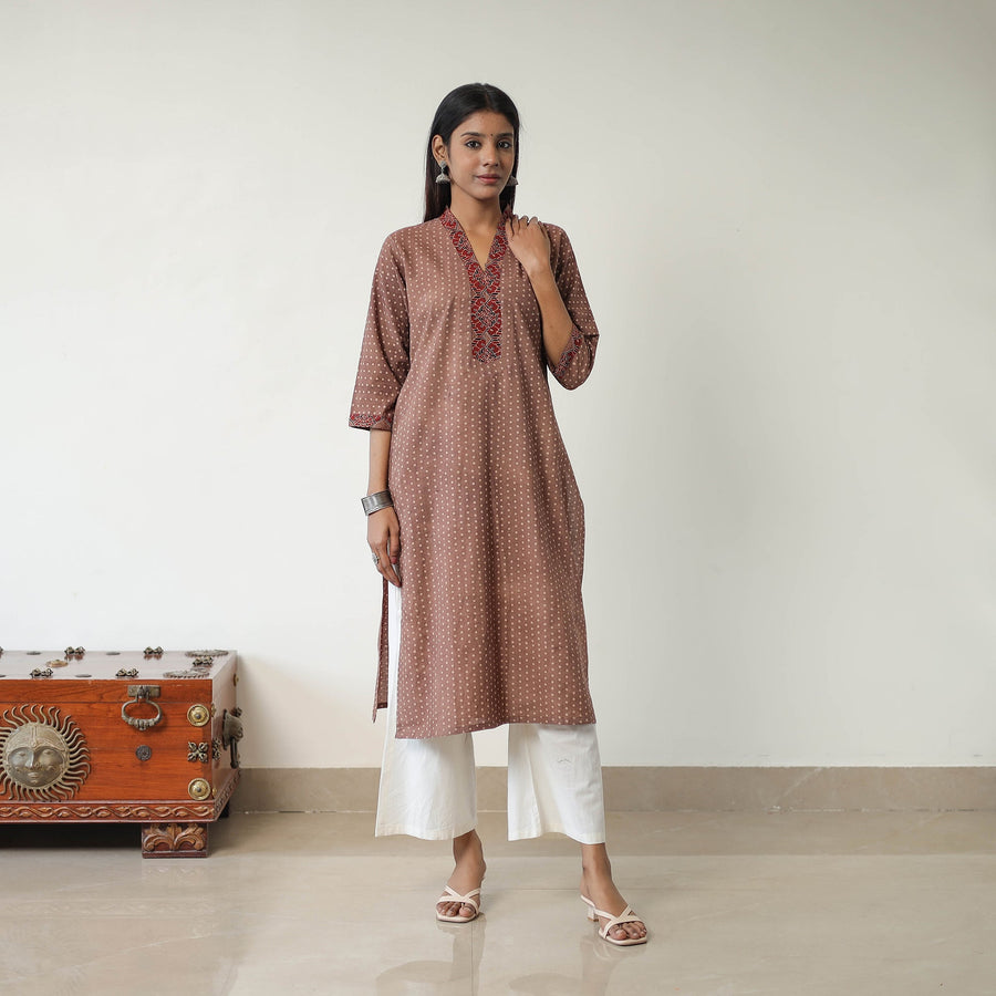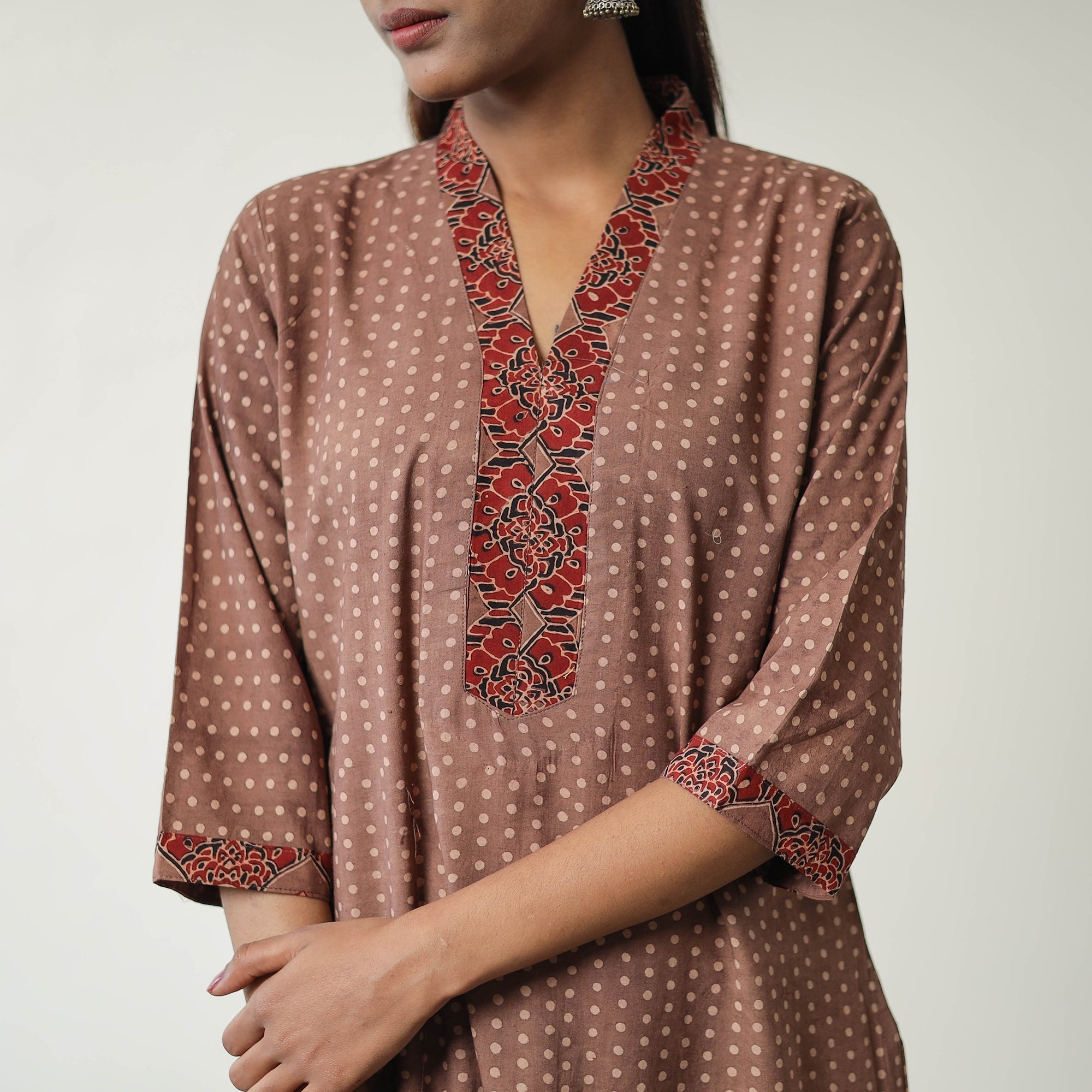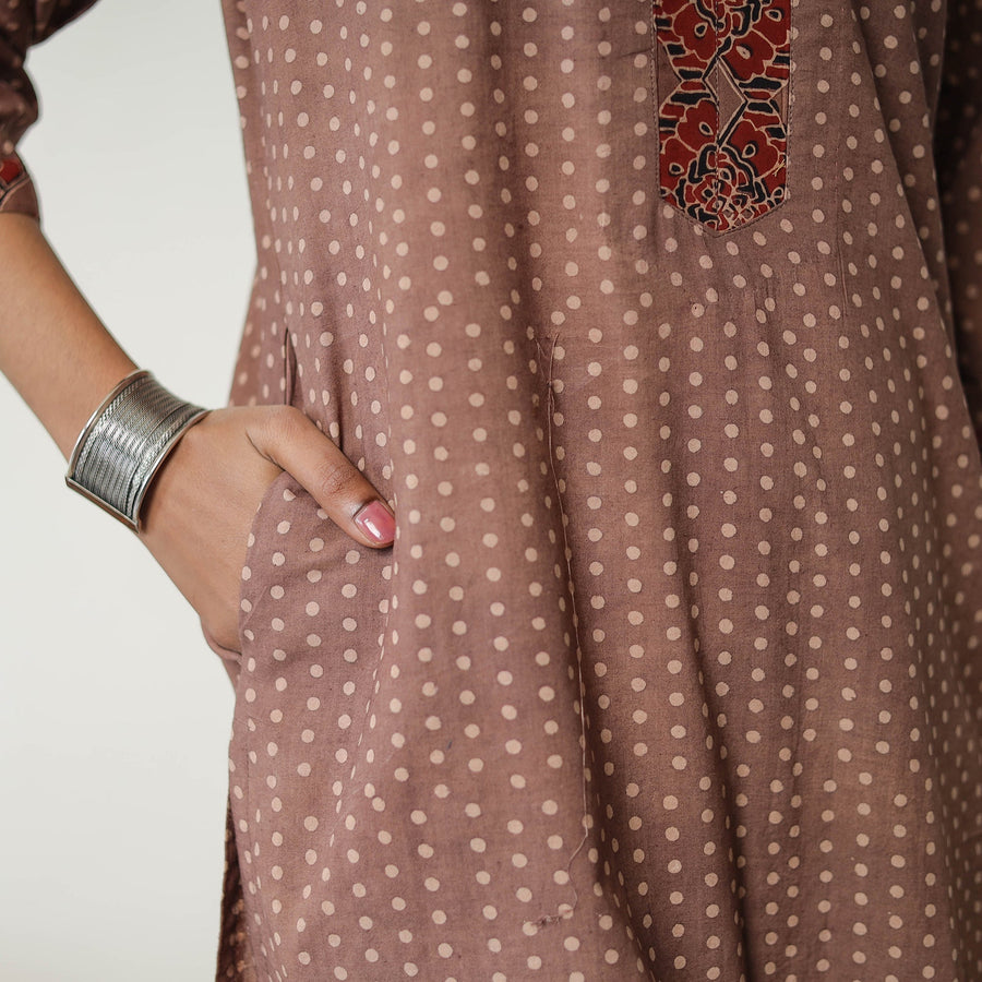 Embrace the timeless beauty of this brown block printed cotton straight ajrakh kurta. This kurta is made using naturally dyed cotton fabric through the traditional ajrakh technique of hand block printing. The breathable cotton makes it ideal for all-day comfort, whether for casual outings or festive gatherings. Add a touch of cultural elegance to your wardrobe and support artisan-made craftsmanship.