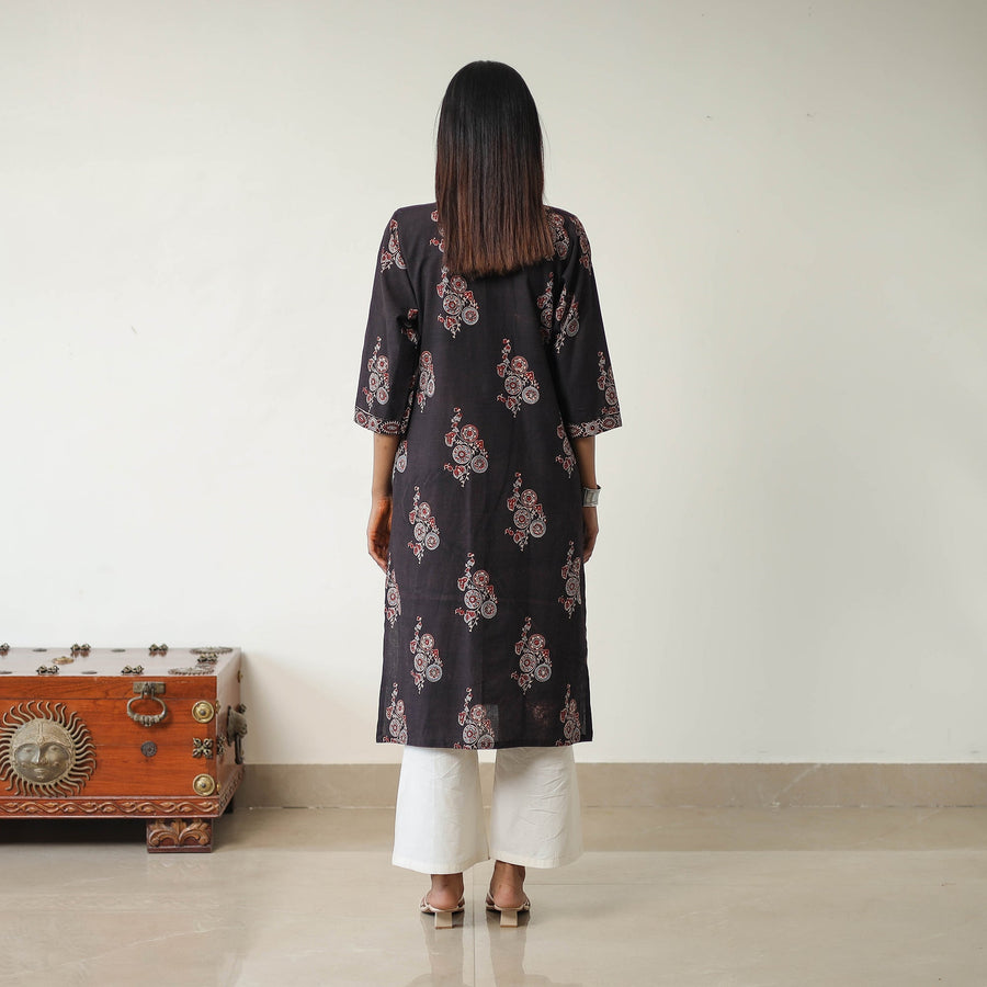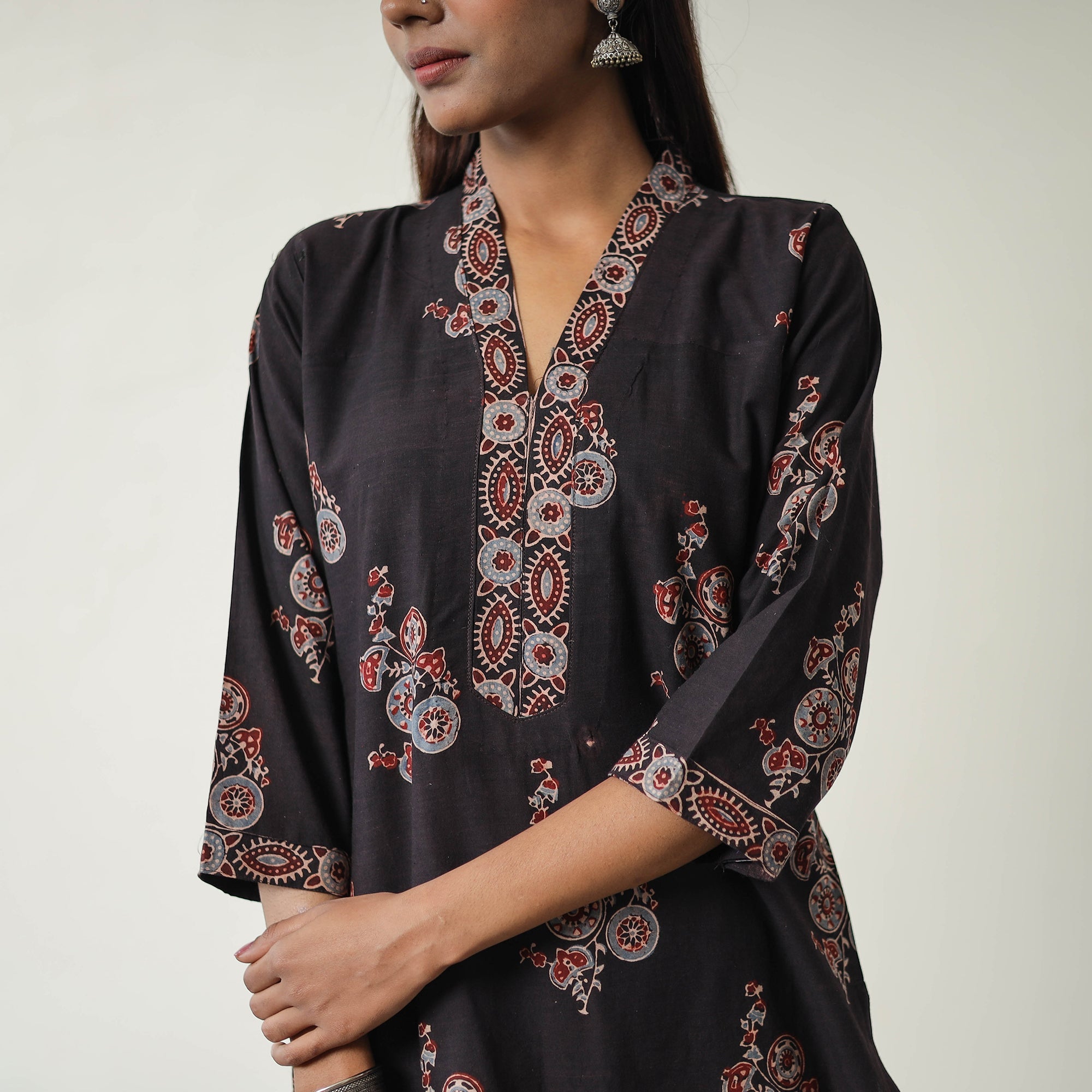 Embrace the timeless beauty of this black block printed cotton straight ajrakh kurta. This kurta is made using naturally dyed cotton fabric through the traditional ajrakh technique of hand block printing. The breathable cotton makes it ideal for all-day comfort, whether for casual outings or festive gatherings. Add a touch of cultural elegance to your wardrobe and support artisan-made craftsmanship.