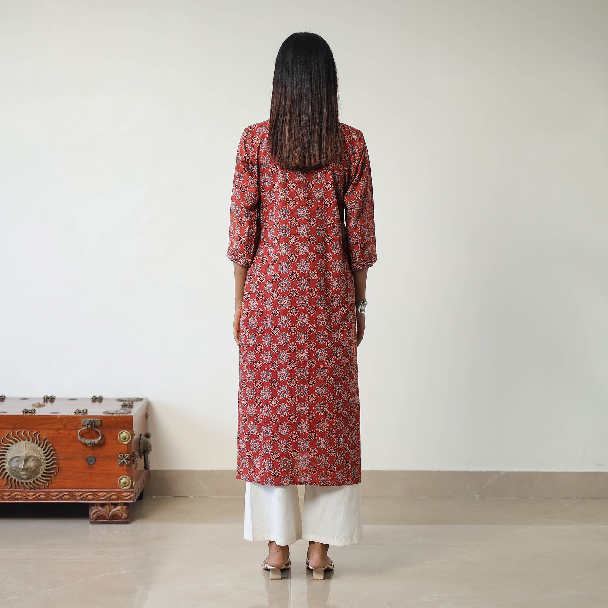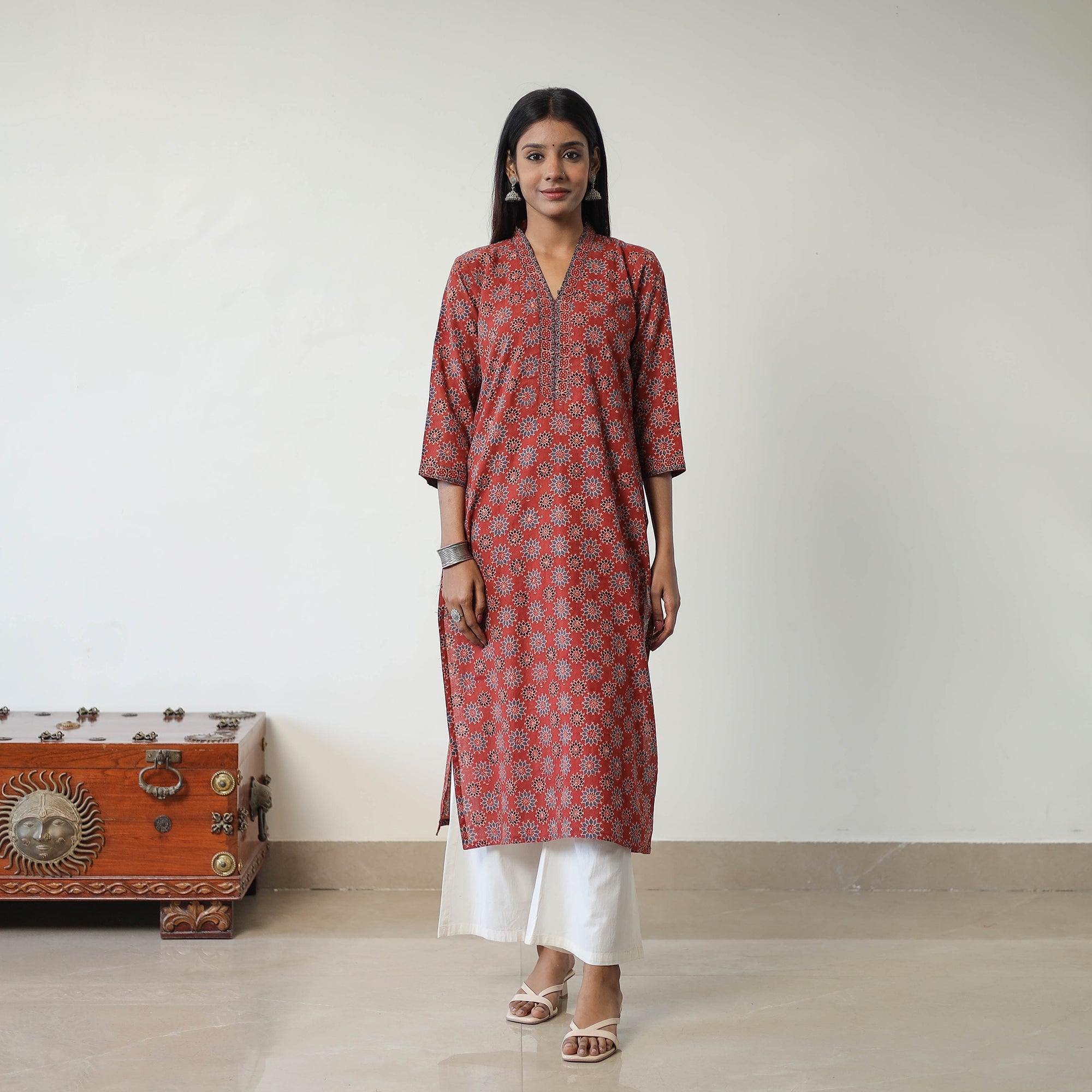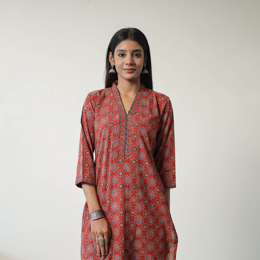 Embrace the timeless beauty of this red block printed cotton straight ajrakh kurta. This kurta is made using naturally dyed cotton fabric through the traditional ajrakh technique of hand block printing. The breathable cotton makes it ideal for all-day comfort, whether for casual outings or festive gatherings. Add a touch of cultural elegance to your wardrobe and support artisan-made craftsmanship.