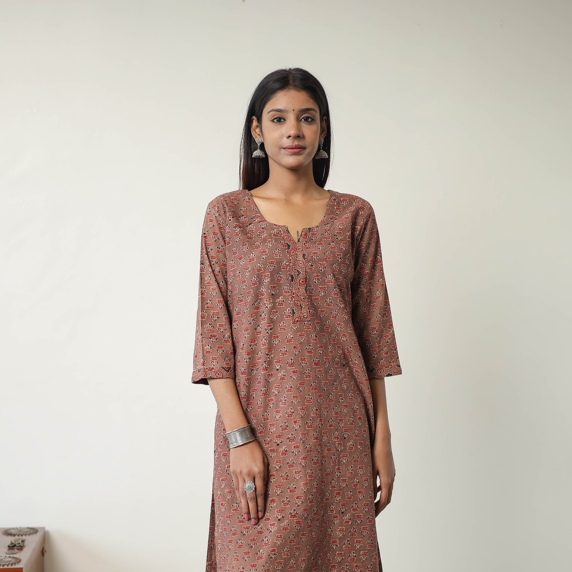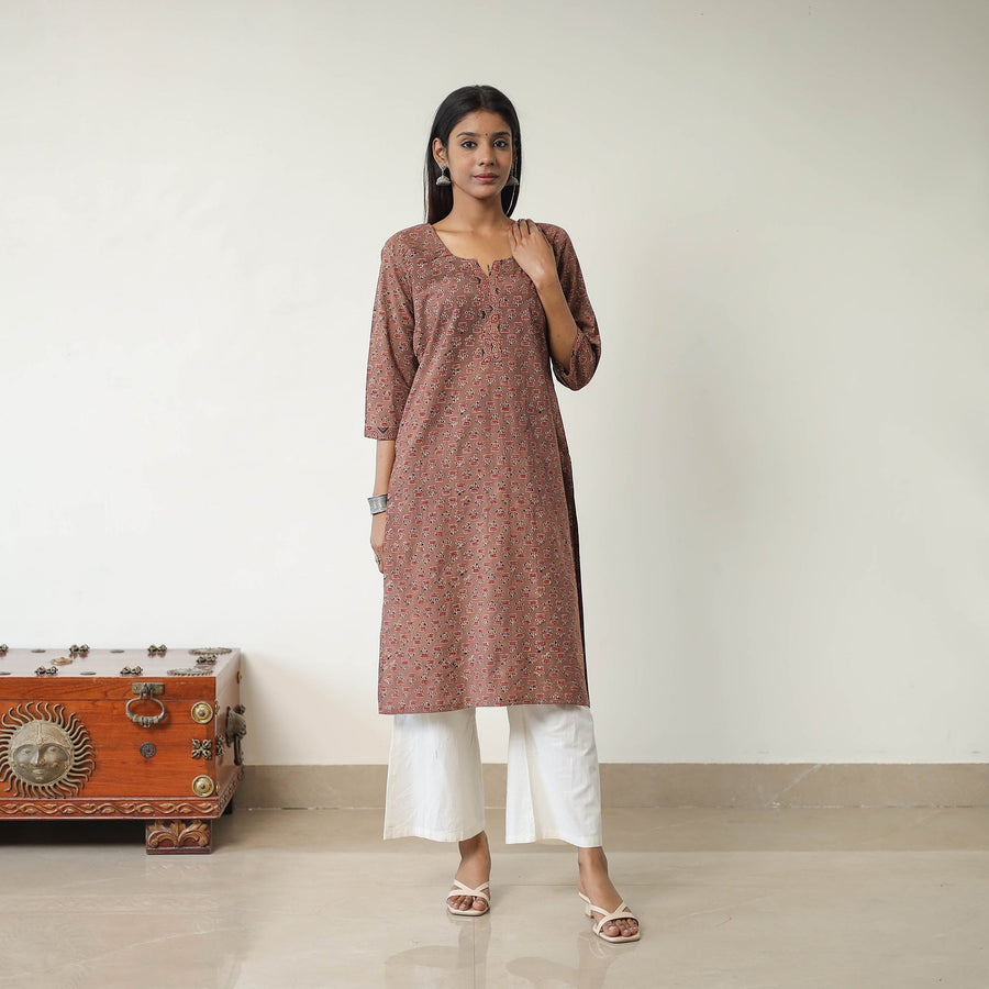 Embrace the timeless beauty of this brown block printed cotton straight ajrakh kurta. This kurta is made using naturally dyed cotton fabric through the traditional ajrakh technique of hand block printing. The breathable cotton makes it ideal for all-day comfort, whether for casual outings or festive gatherings. Add a touch of cultural elegance to your wardrobe and support artisan-made craftsmanship.