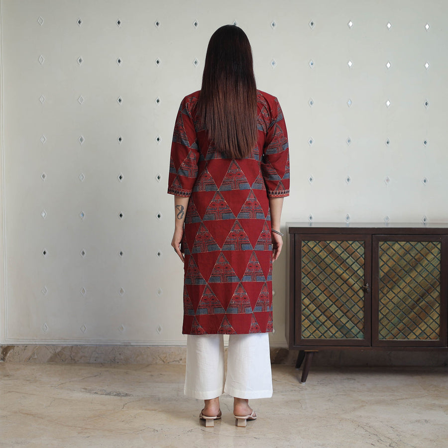 Embrace the timeless beauty of this red block printed cotton straight ajrakh kurta. This kurta is made using naturally dyed cotton fabric through the traditional ajrakh technique of hand block printing. The breathable cotton makes it ideal for all-day comfort, whether for casual outings or festive gatherings. Add a touch of cultural elegance to your wardrobe and support artisan-made craftsmanship.